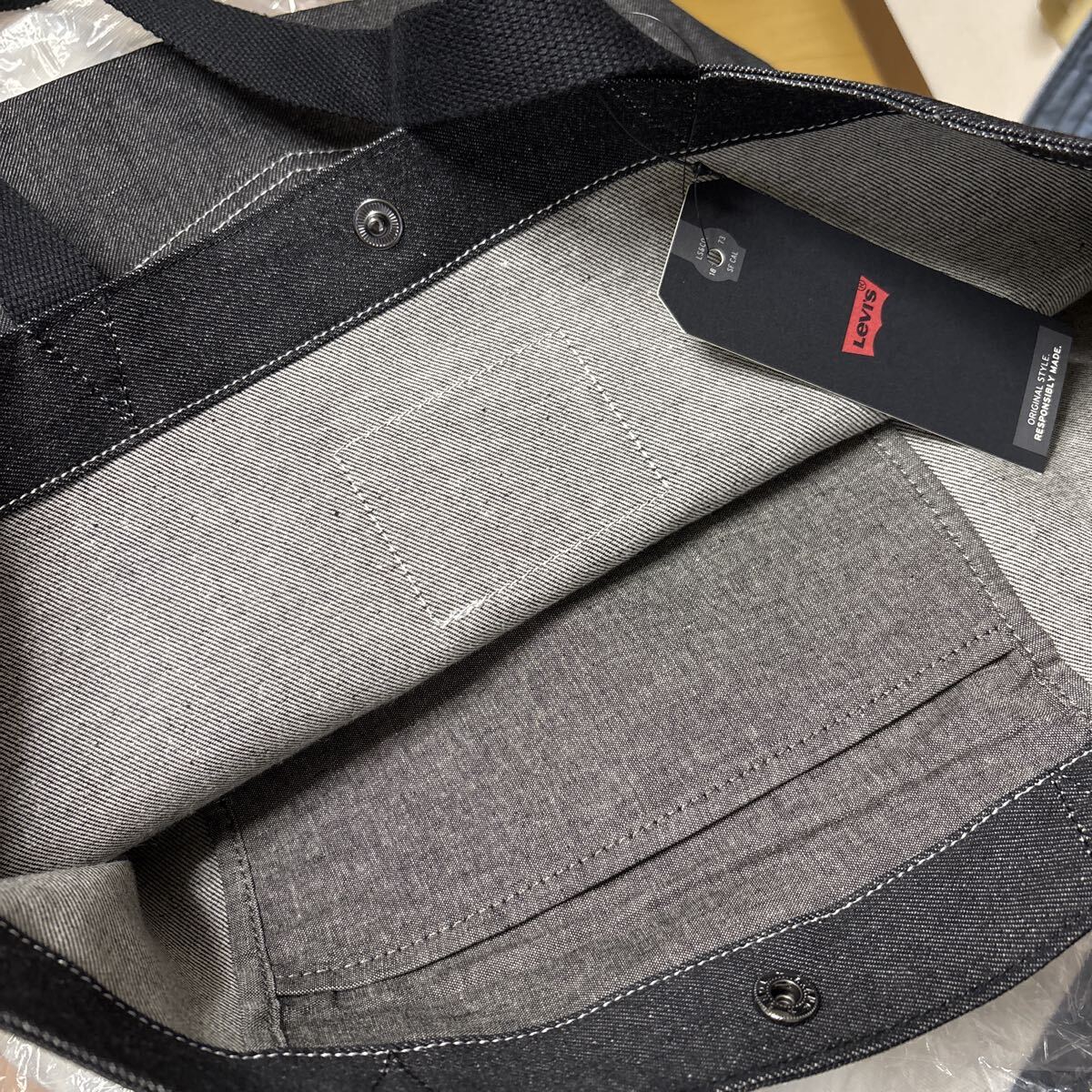 リーバイス 黒デニムトートバッグ新品になります。使う機会がありませんでした。底13.5×33。高さ34.とって63センチ。肩から掛けられる長さです。中にポケット、留ホック付き。
