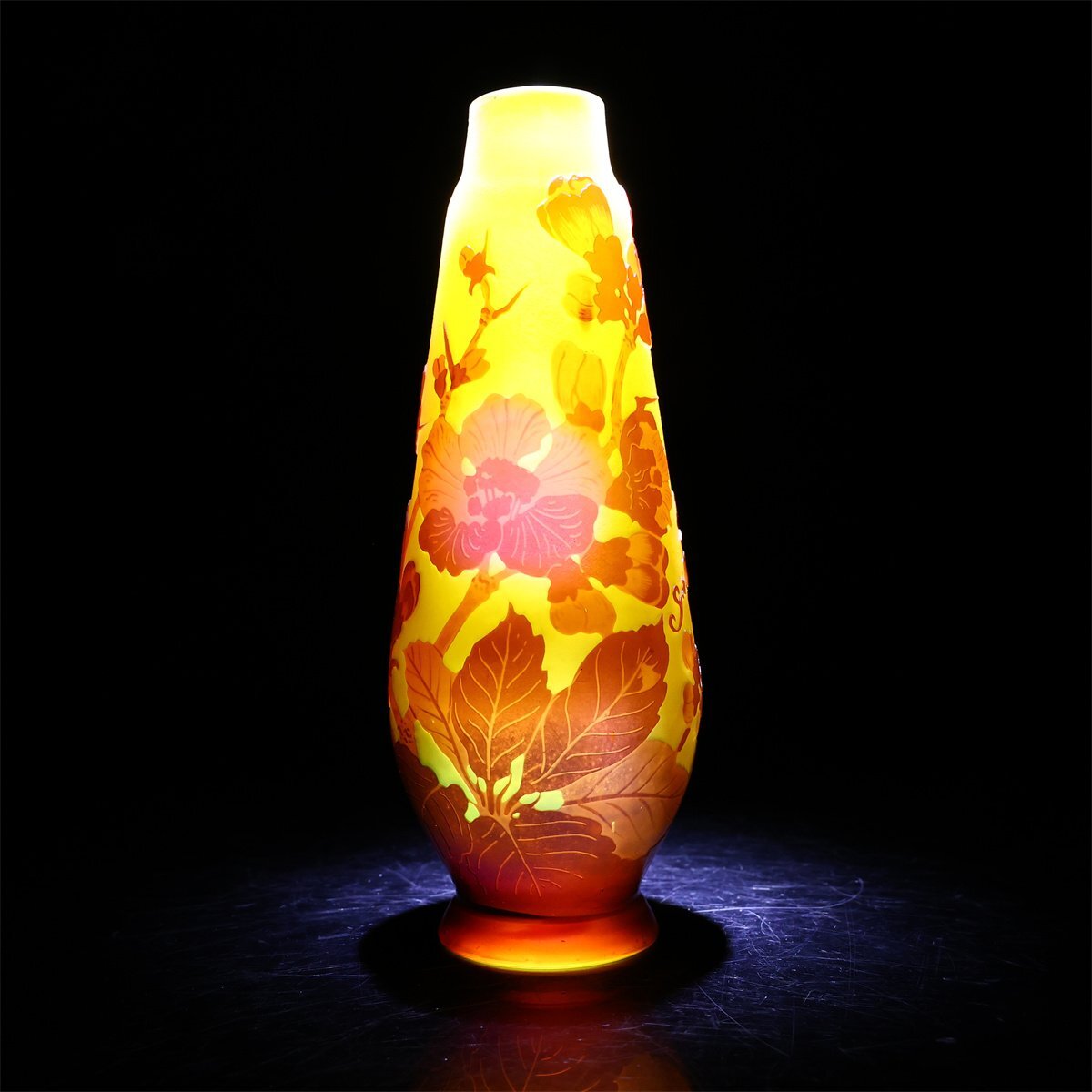 Product name: 【吉】PC713 Emile Galle 【エミール・ガレ】 被せガラス 花紋 花瓶 高16㎝/箱付 本物保証 美品!