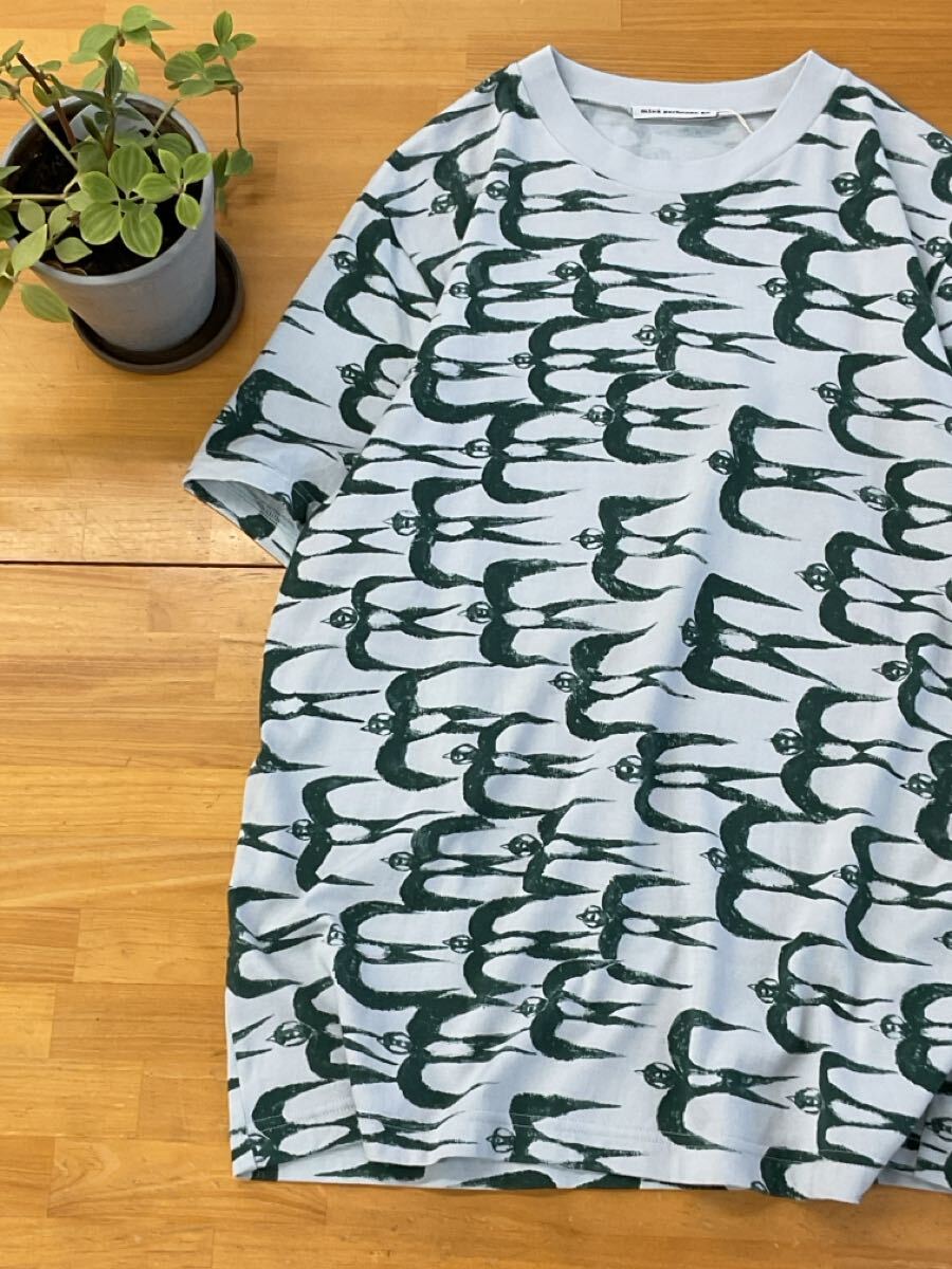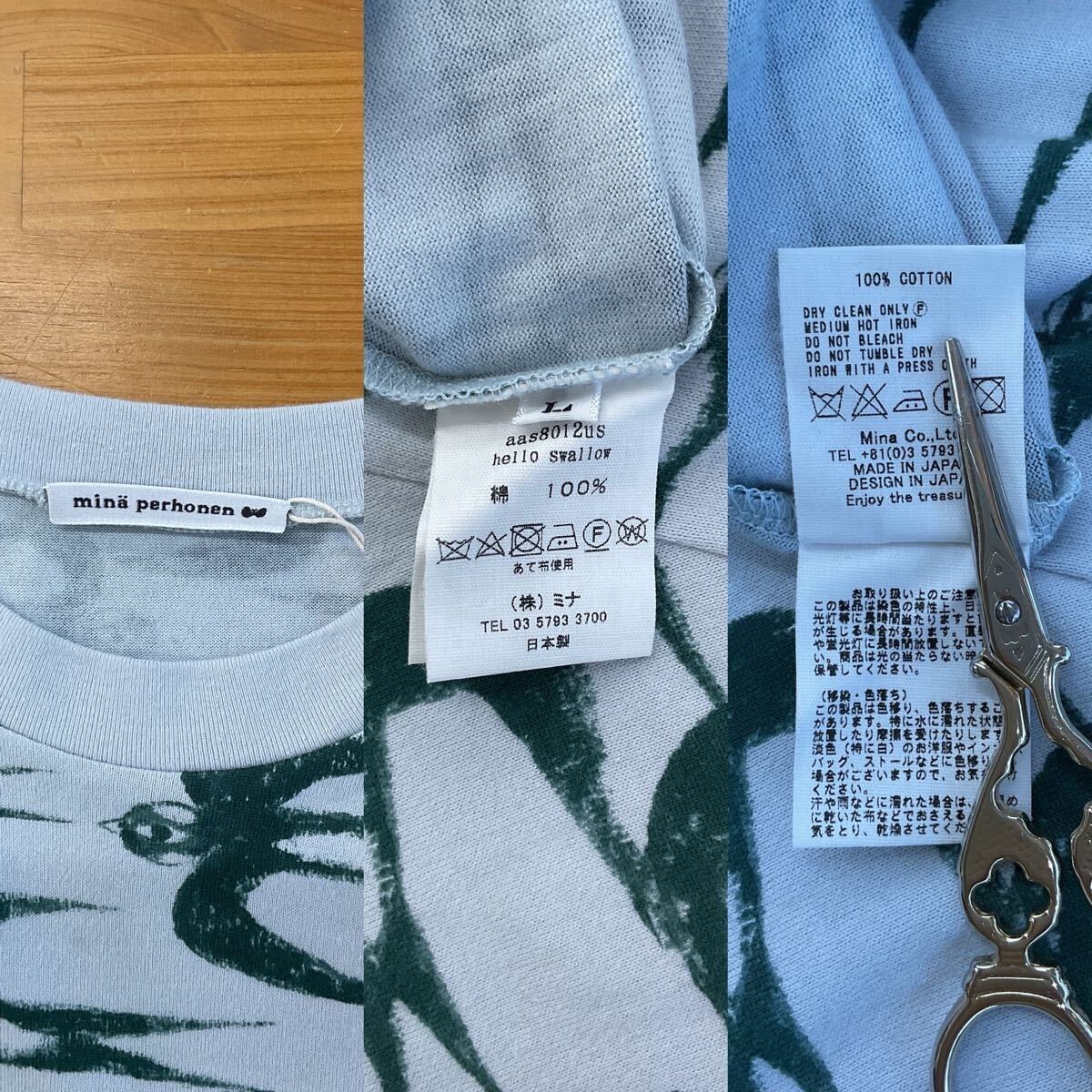 mina perhonen ミナペルホネン hello swallow コットンツバメ柄Tシャツ 綿100%半袖トップスカットソー グレー灰緑色系 Lサイズ q