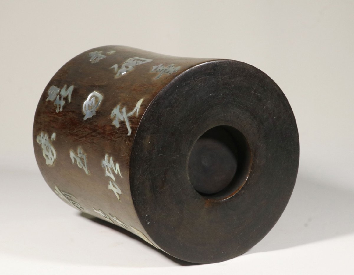 【安】清時代 海南黄花梨 嵌め螺鈿 博古漢詩紋筆筒 細密毛彫 書道具 文房具 中国古美術 時代物 古董品 318