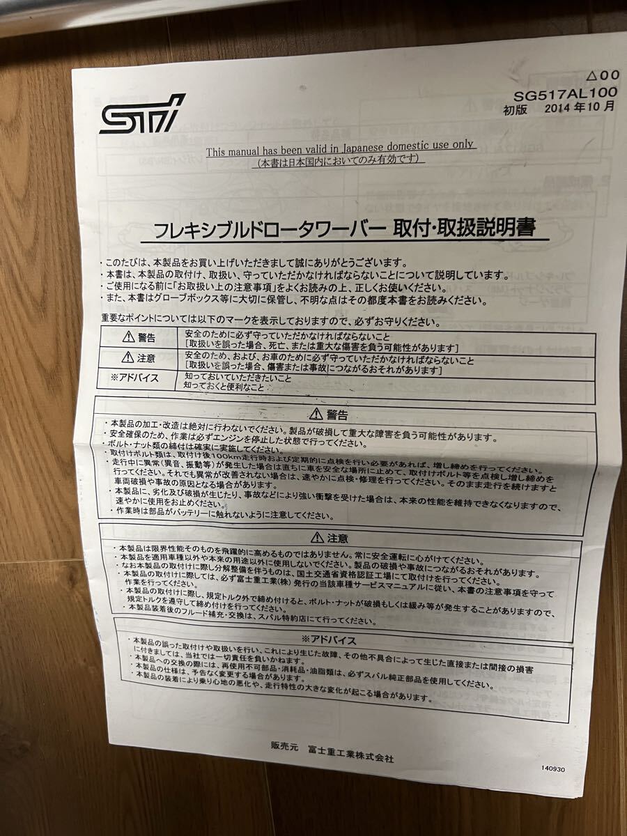 SUBARU スバル 純正部品 レガシィ STI フレキシブルドロータワーバー SG517AL100