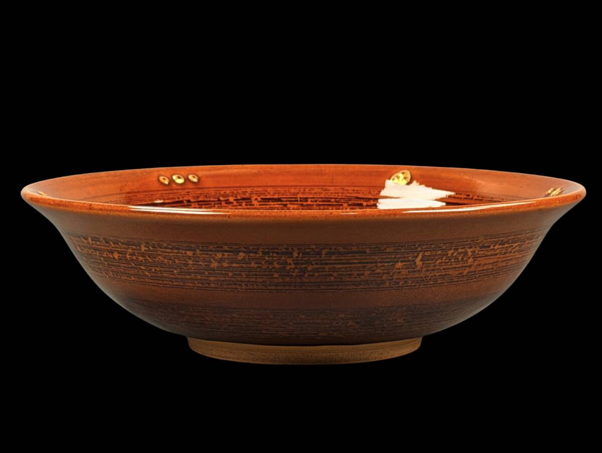 Product name: 【偲】十代 大樋長左衛門 鉢 飴釉 茶碗 二重箱 大樋釉 金彩貼花紋 花鳥紋 七十七古翁 在銘 共箱 共布 名工 茶道具 直径約20.4㌢ c-289