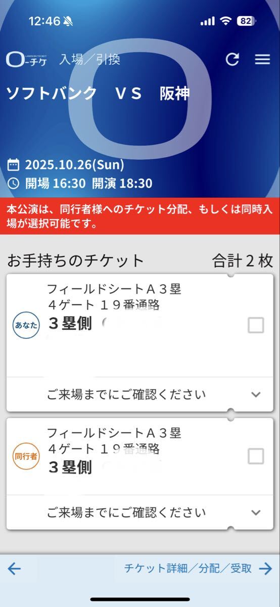 ローチケの電子チケットの為1人で行く方は、分配するのでご連絡ください。2人で行く方は別途ご相談ください。当日ドームに居ますので、問題はありません。