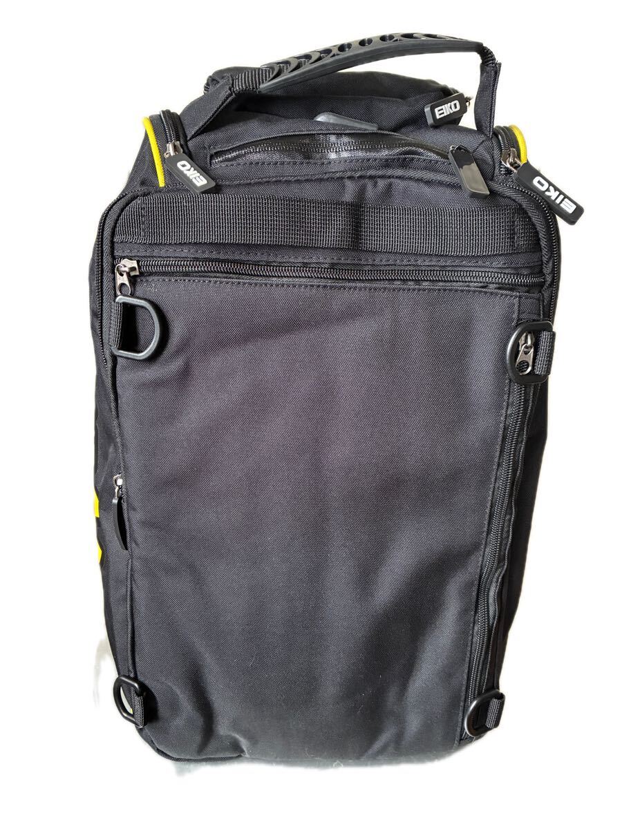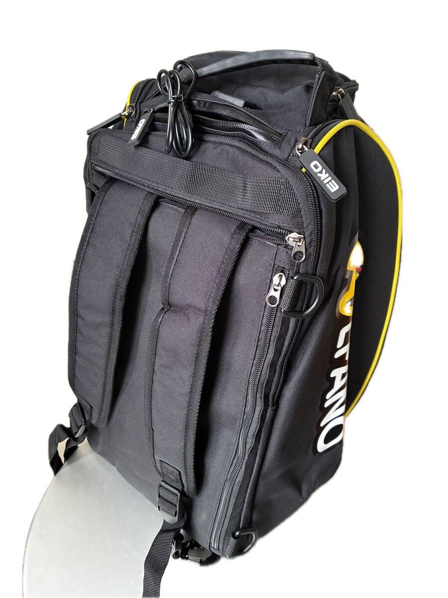 ご覧の通り、シールドケース、多数のポケットや、USBポート、リュックなどマルチな装備を備えた軽量なバッグです。
