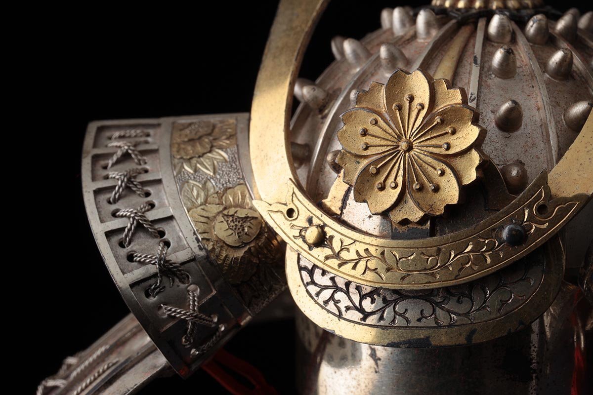 FA922 時代金工【高島屋謹製】精巧 銀製 桜前立 星兜形 ボンボニエール 幅10.8cm 重190g 銀製刻 専用箱付・宝石箱 金工古美術