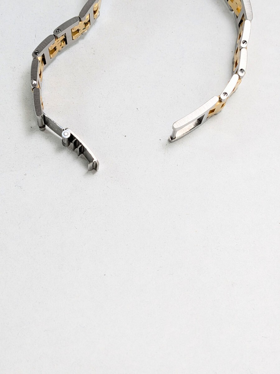 ○ケース、ブレスレットは磨きをかけたためキレイな状態になります。深いキズは取りきれませんのでご了承下さい。ガラスは、目立つキズ等は見受けられません。ブレスの金色部の裏側に、経年劣化してる箇所が若干あります。