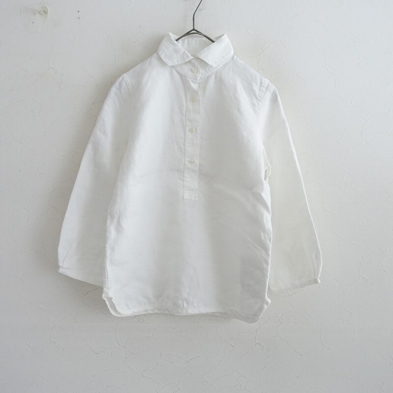 minaの「shirts」リネンオックスプルオーバーシャツです。カラーはオフホワイトです。少しハリ・コシがあり、程よい厚みのある麻オックス生地を使用。少し透け感がございます。台衿が高くあしらわれたポインテッドカラーに、前立て4ボタン仕様のプルオーバーシャツです。袖口は上部にタックを寄せ、1ループ・ボタン留めです。裾はラウンドヘムです。ポケットはございません。