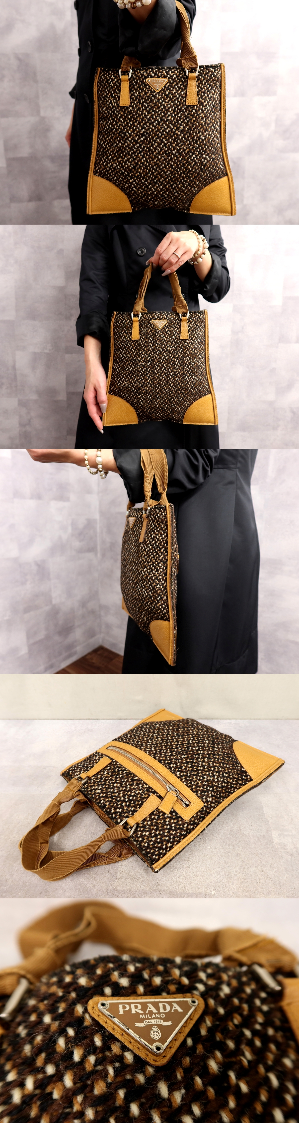 Product name: ●超美品●PRADA プラダ●ツイード カーフ レザー 本革●ハンド バッグ●ブラウン系●シルバー金具●イタリア製●ヴィンテージ●Js64576