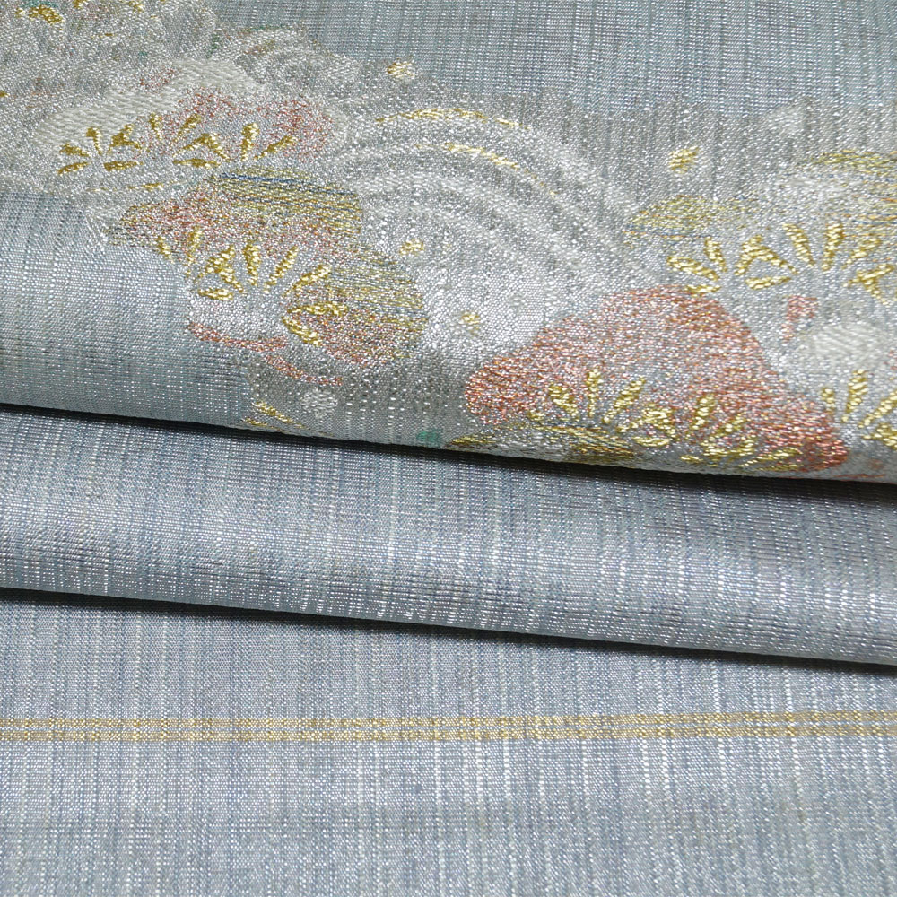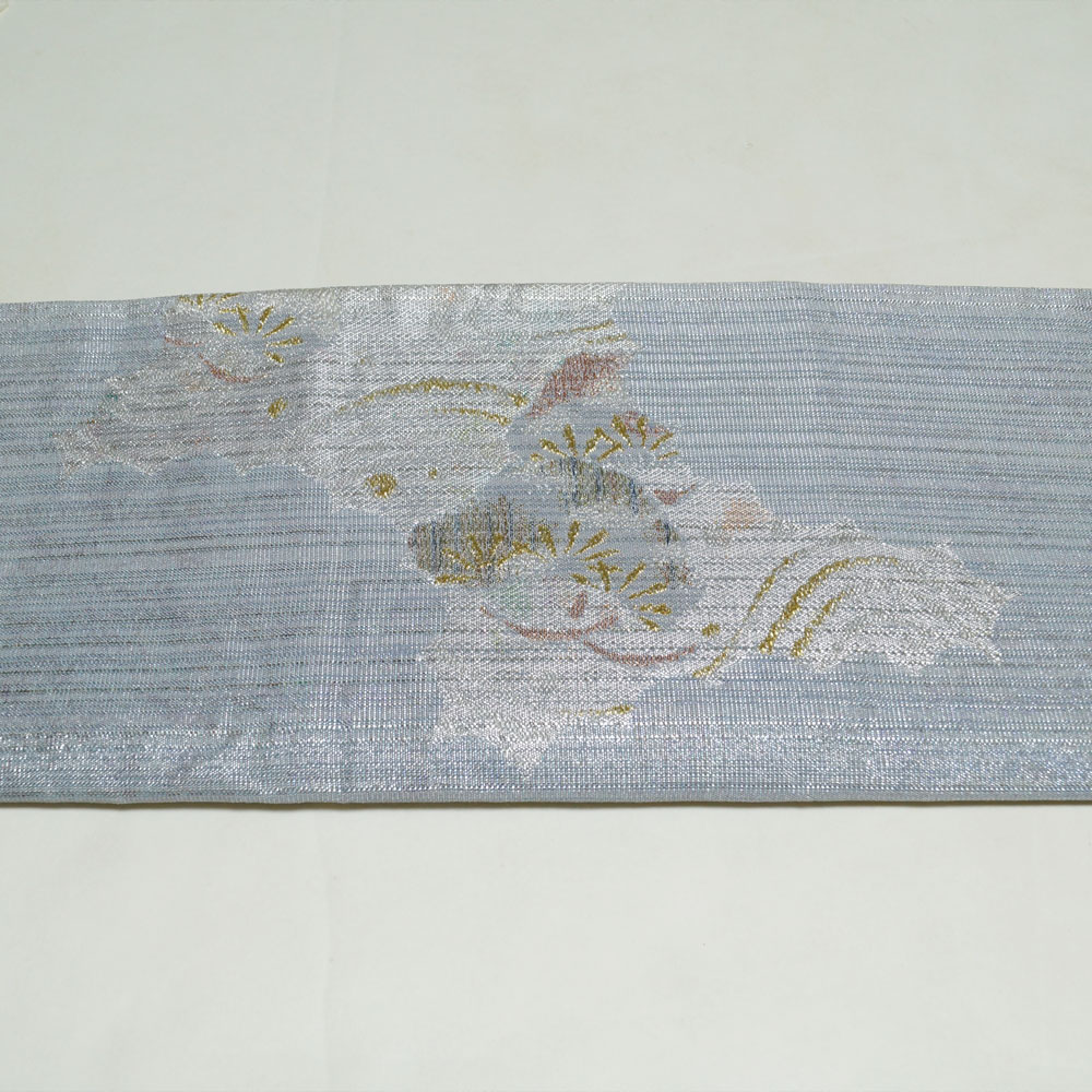 縞模様が施された銀色系の地に、雲取に松、波頭模様などが織られた二部式に作り変えられたフォーマル袋帯です。 お太鼓部と胴回り部の二部式になっています。(セパレートされています。)