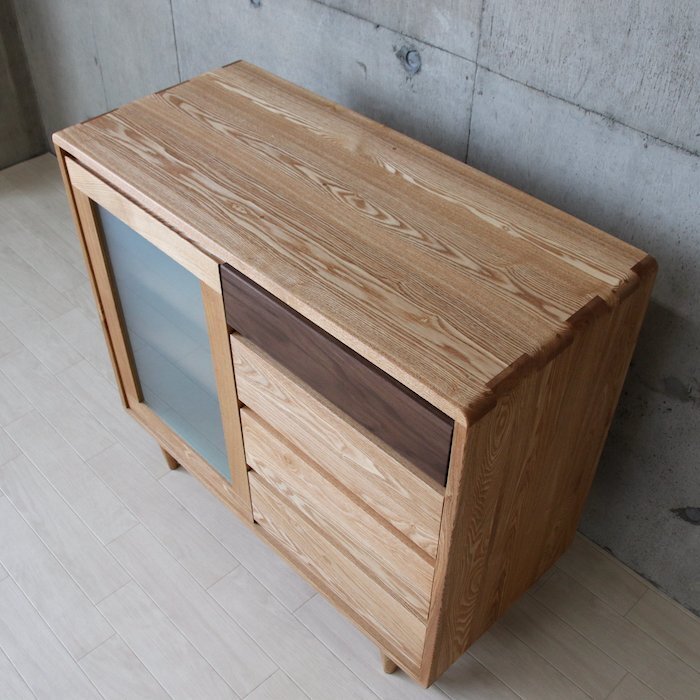 本体はタモ無垢材仕様、ガラスは内部がわかりにくいミストペンガラス。幅120サイズもあります。