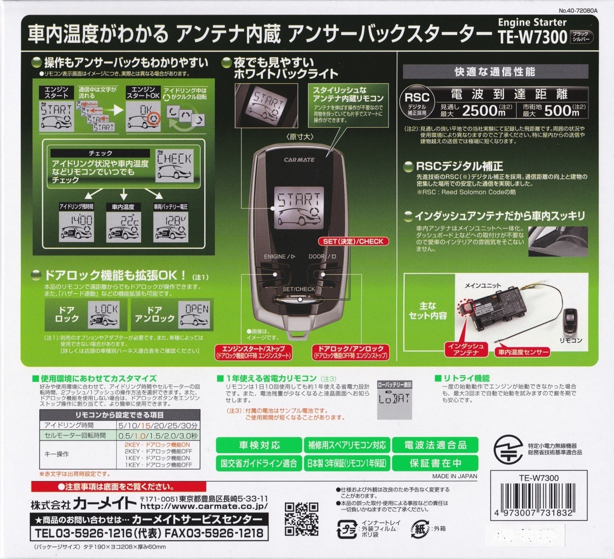 Product name: カーメイト 双方向 アンサーバック リモコンスターター TE-W7300 新品