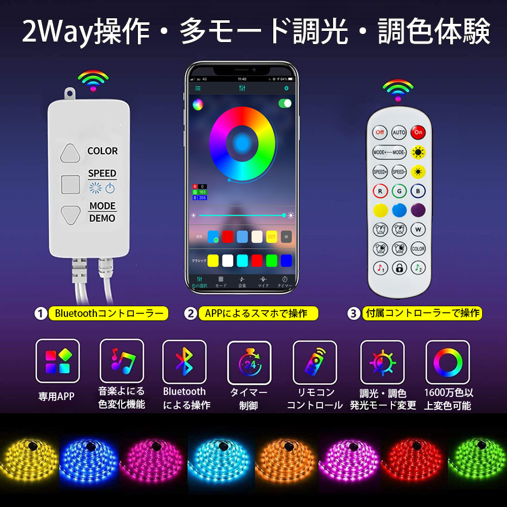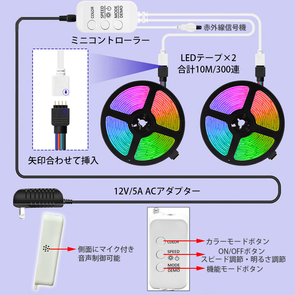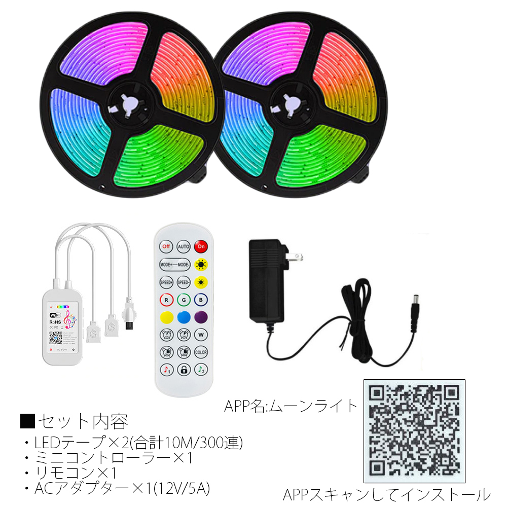 LEDテープライト 5050チップ 300連 RGB 10m(5m×2本) DC12V ACアダプタ付 リモコン/アプリ制御 両面テープ付 1年保証