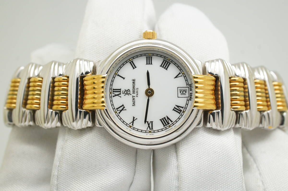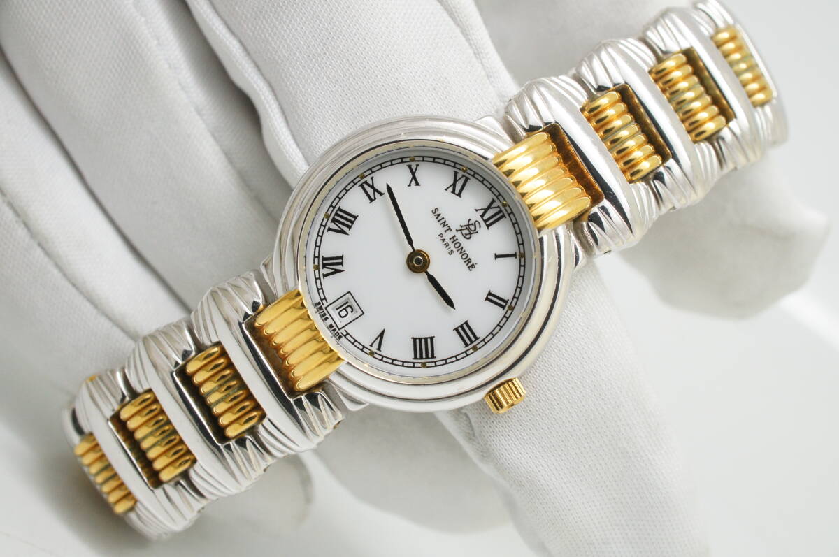L66●作動良好 美品 SAINT HONORE サントノーレ スイス製 白文字盤 デイト ローマン数字 レディース腕時計 コンビ お洒落 クォーツ