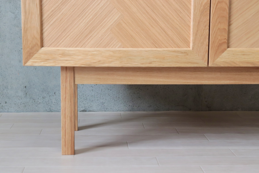 ヘリンボーン柄に貼り合わせたランダムな木目が単調になりがちな木製の収納家具に深みをあたえてくれます。