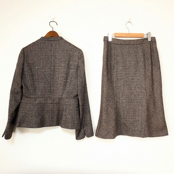 #wnc アクアスキュータム Aquascutum スカートスーツ 10 茶系 ツイード ノーカラー サイドファスナー カシミヤ混 レディース [924597]