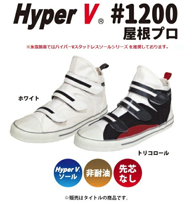 日進ゴムNISSHIN RUBBER滑らない作業靴を追求!!HyperV屋根プロ#1200※販売はタイトルの商品です。世界最高峰の防滑性能を誇るハイパーVソールを搭載した高所作業用ワークスニーカー。■特長しゃがんだ姿勢でも靴がカカトから脱げないように足首からしっかりとホールドする3本のベルト&サイドゴア仕様。足裏で地面の感覚が把握しやすいようにあえて薄目に設計されたソールなど、高所作業時の着用者の安全をサポートする機能を搭載しています。■仕様・商品名:ハイパーV 屋根プロ #1200・カラー:ホワイト、トリコロール・先芯:無し・アッパー材:綿・合成皮革・底材:合成ゴム(ハイパーV)・平均重量:345g(26.0cm片足)※氷雪路面ではハイパーVスタッドレスソールシリーズを推奨しております。