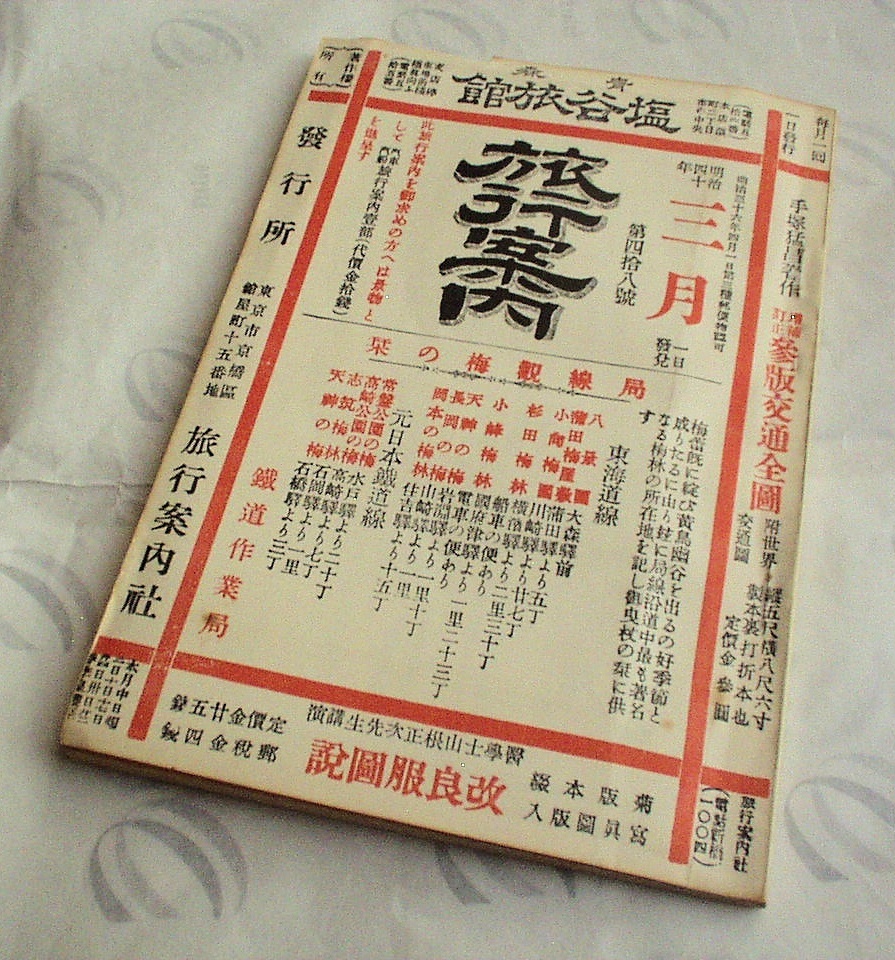 「旅行案内」明治40年3月1日発行 旅行案内社。鐡道、汽船、人力車など当時を偲ばせる資料です。