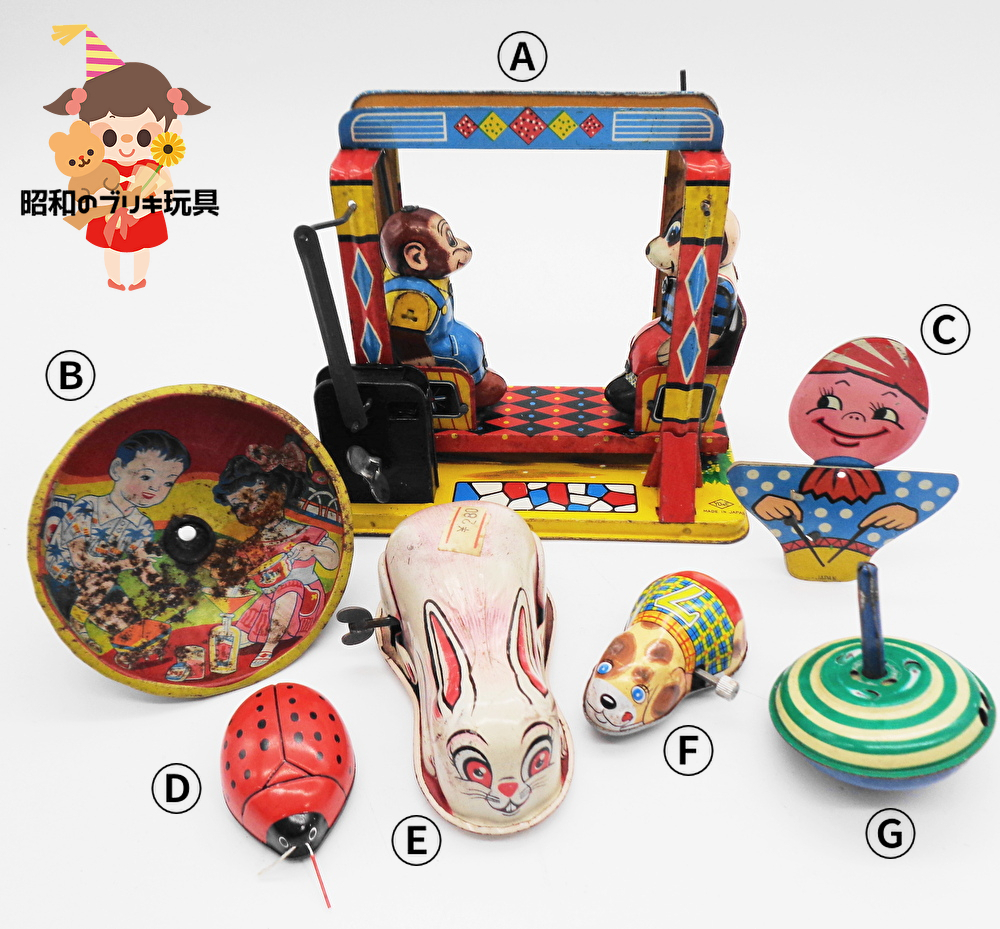 1960年代ブリキ玩具□彡ANIMAL SWING(犬と猿のシーソーブランコ)じょうご、コマ他□彡ジャンク品扱い