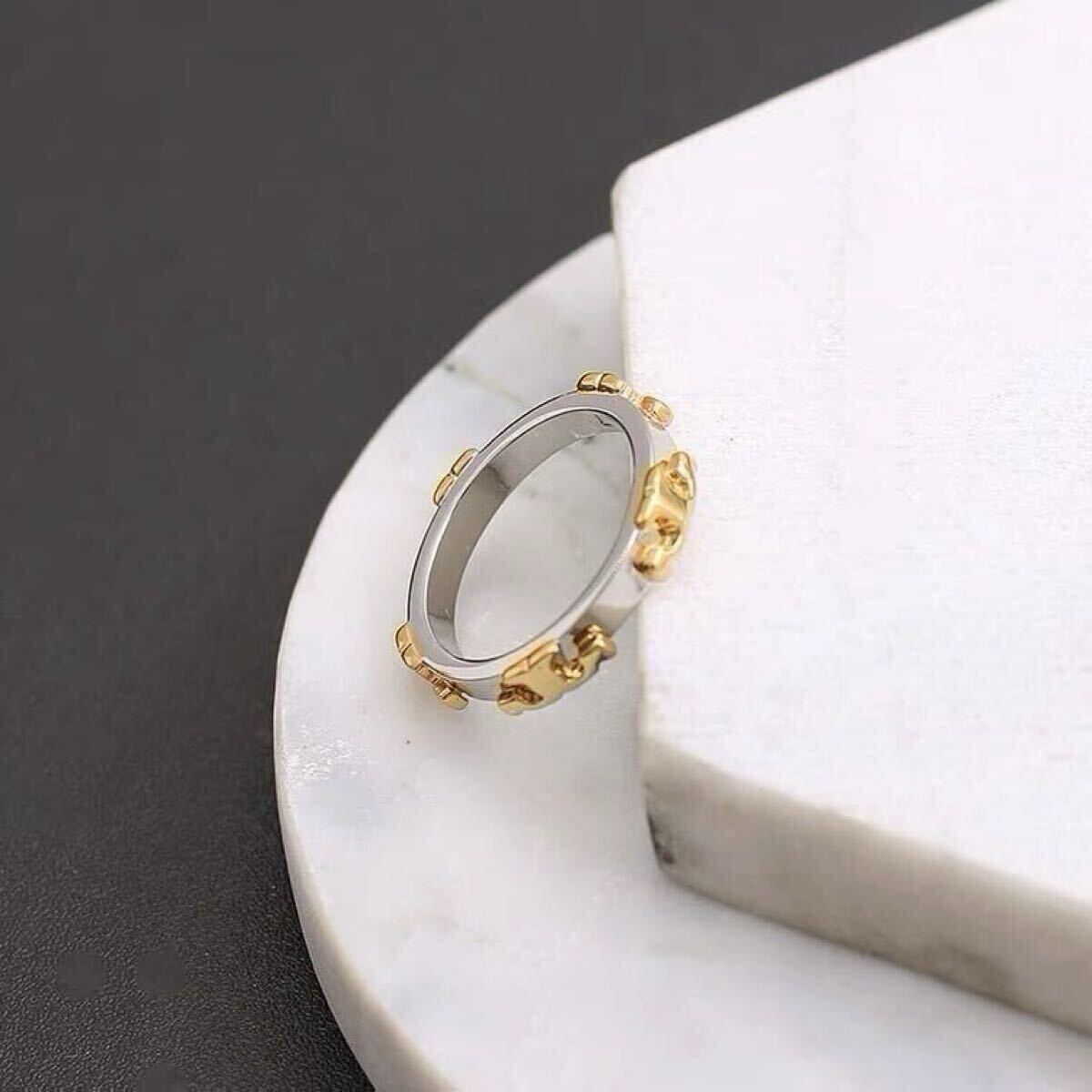 トリーバーチ 新品未使用 本物 大特価 シルバーのベースにあしらわれたゴールドのロゴが上品で、洗練された印象を与えます。細身のデザインなので、他のアクセサリーとも合わせやすく、指先にさりげない高級感を添えてくれそうです。