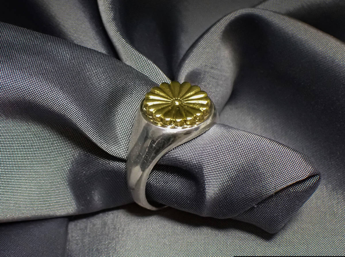 銀製(silver925)の印台指輪の上面に菊紋(真鍮)を誂えております。