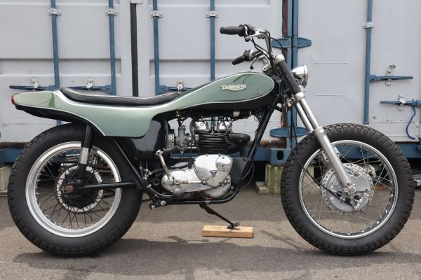 1966年 T100 の入庫です。 出品前パーツクリーナーで初爆確認済みです。 珍しいトレイシーボディが装着されCOOLな1台! フロント周りはダブルドラムにカスタムされており、スズキの足回りを流用している様でバランスよくカスタムされてます! 人気のアップマフラー装着!タイトル年が1966年なので保安部品もウィンカー等はなしで行けると思います。カスタムも良し、そのままメンテナンスして乗るも良しの1台です。