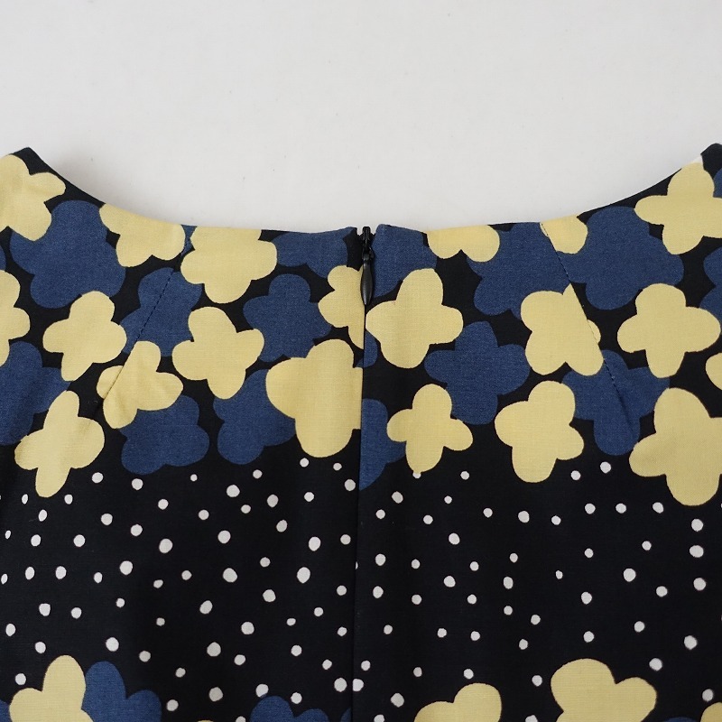 marimekkoのUNELMA KUKKASADE プリントワンピースです。カラーはブラックベースにイエローベージュ・ネイビーグレー・ホワイトの総柄プリントで、少しストレッチ性のある布帛地です。後ろの半開ファスナーで着脱でき、腰両サイドにシームポケットがあり、袖以外に裏地付きです。