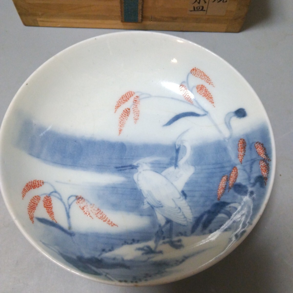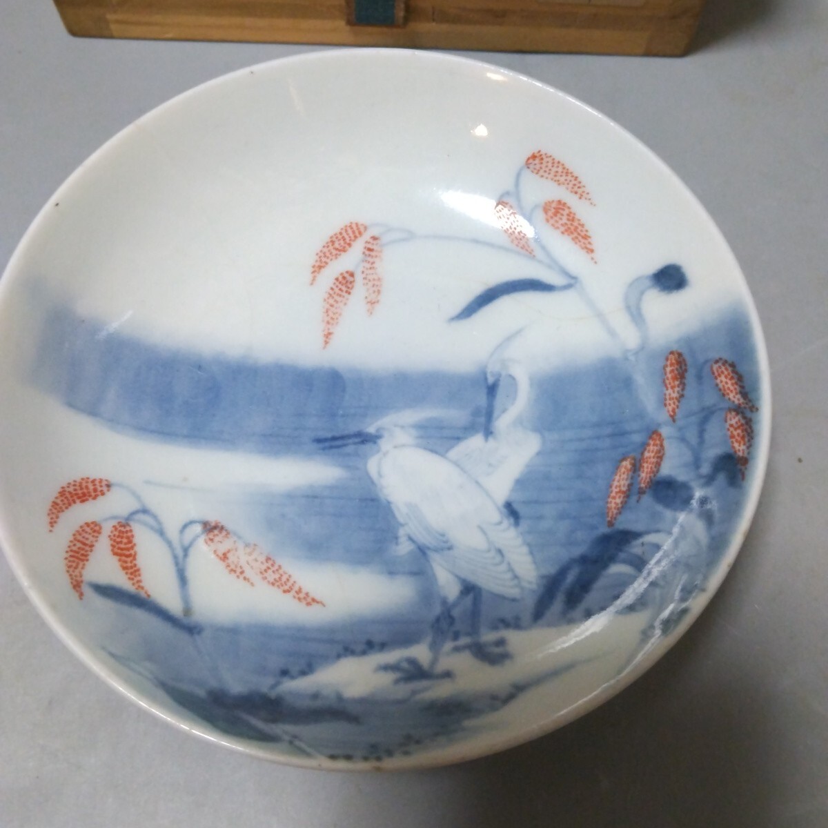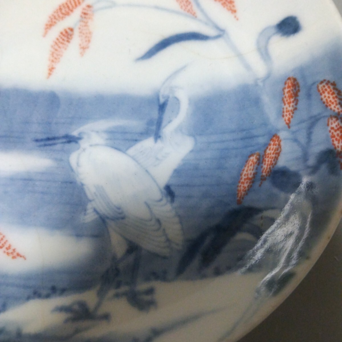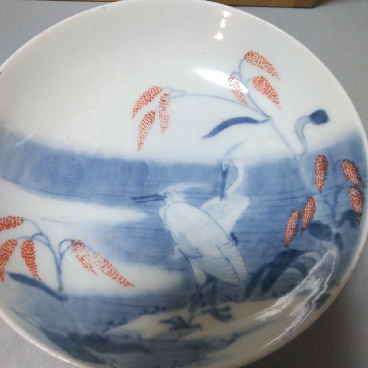 白鷺が非常によくかけて魅力あふれる素晴らしい感覚のものです。高台に小さなホツがありますがあまり気になりません。口径12.5センチ高台径6,5センチ高さ3,5センチ