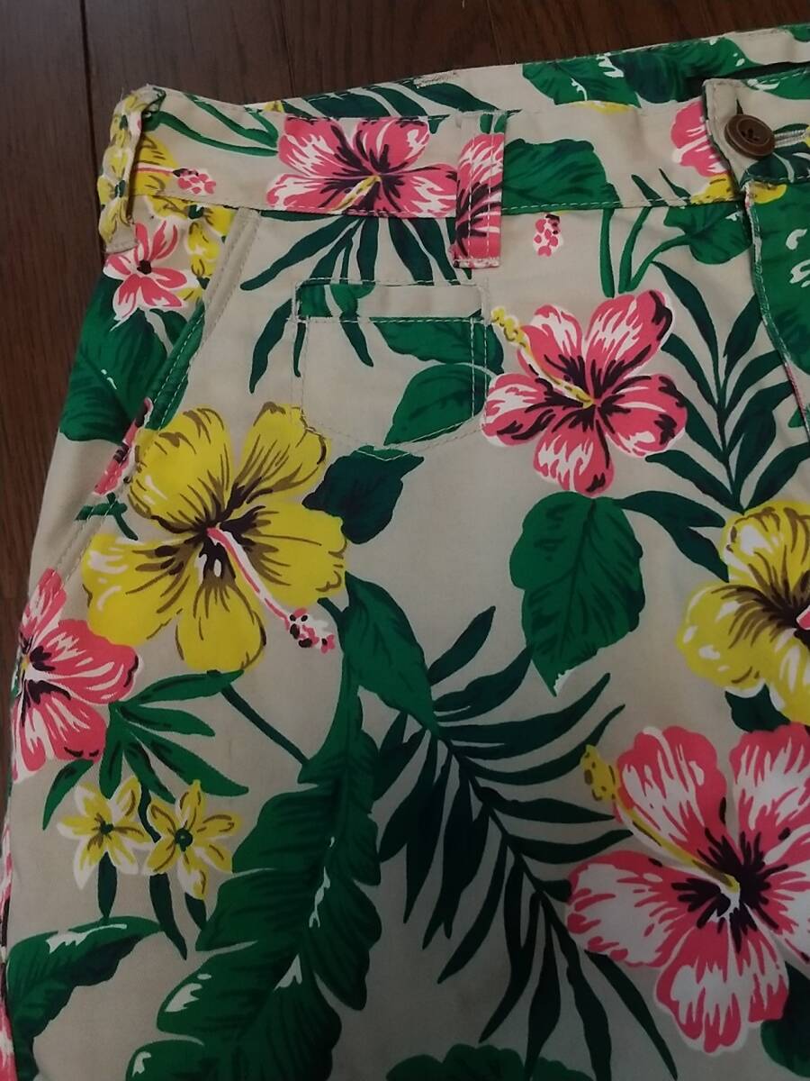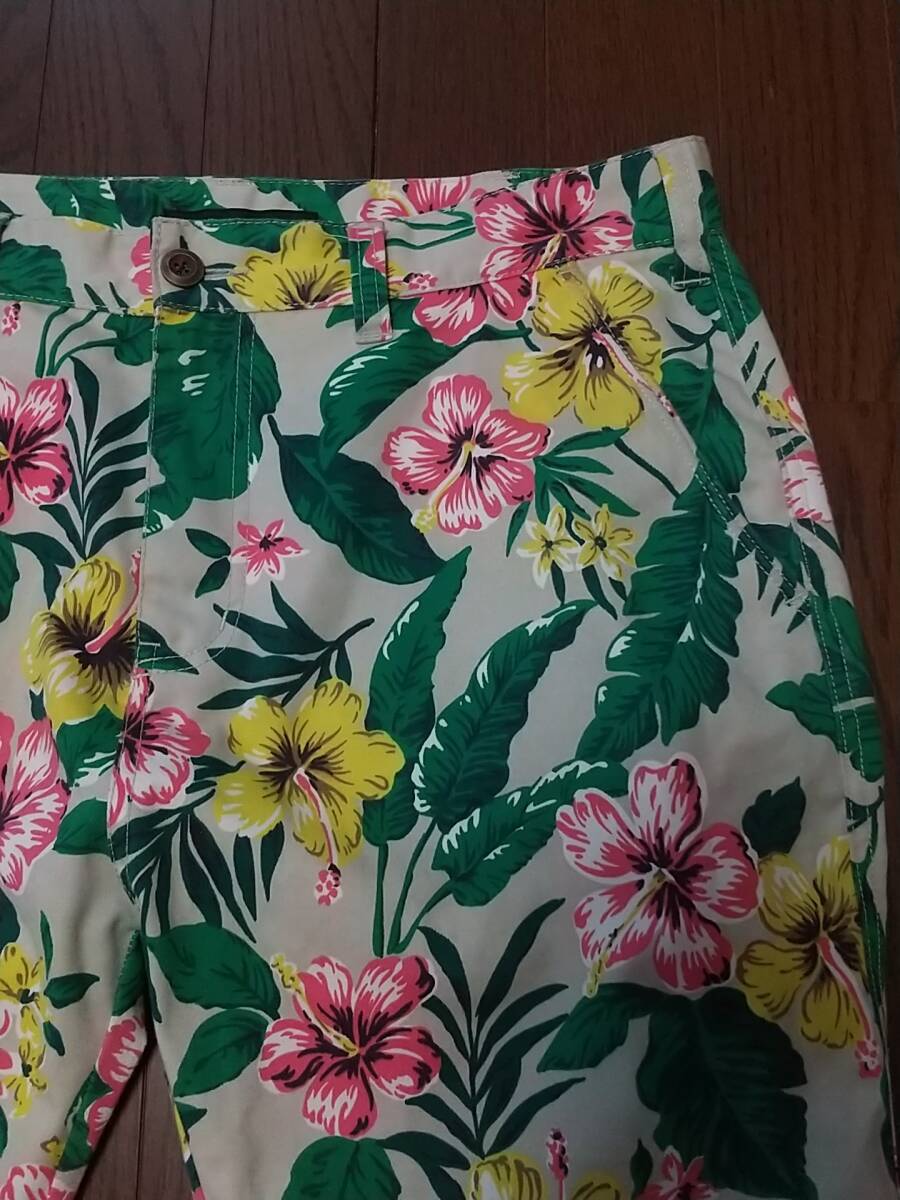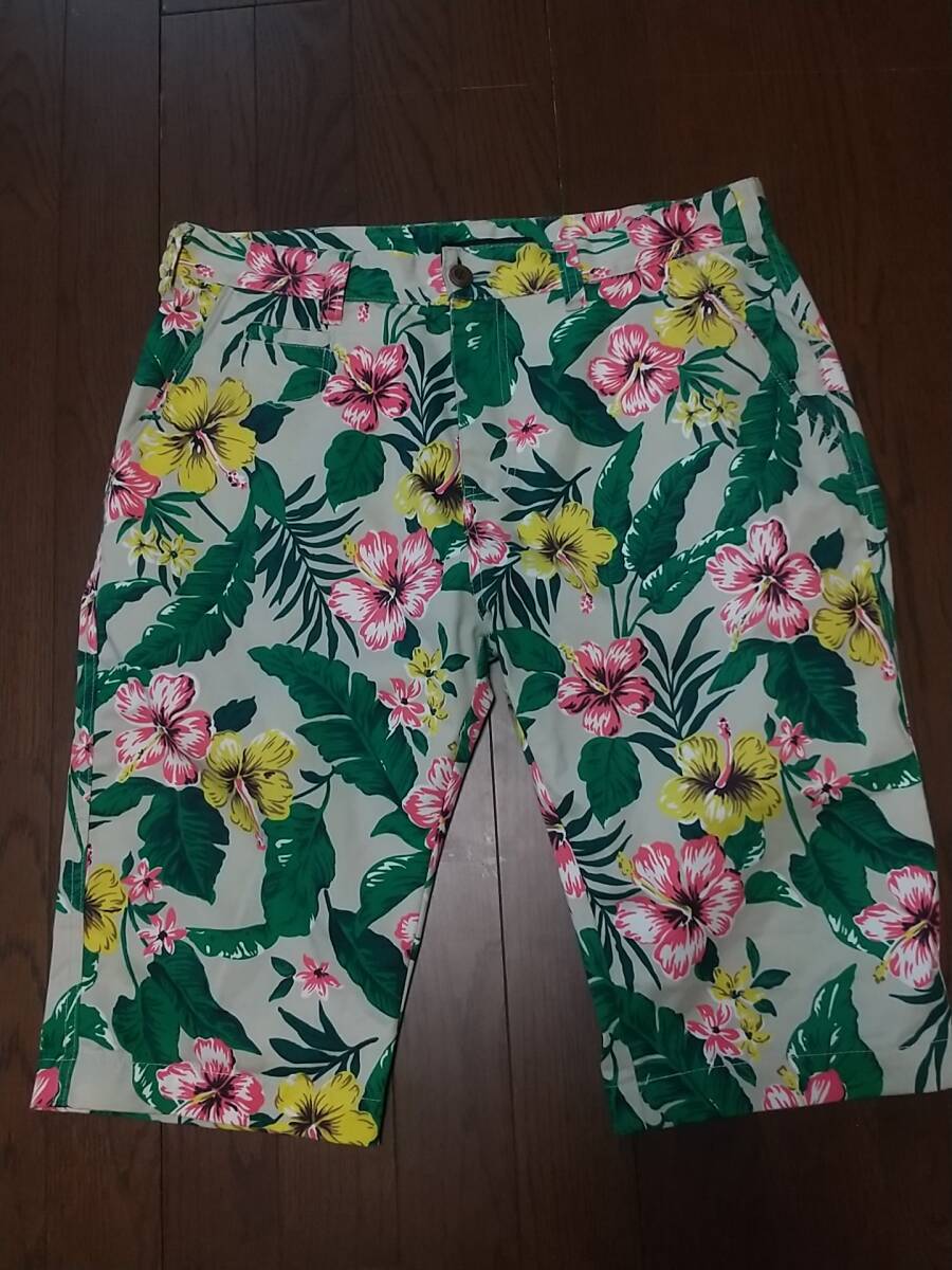 ボタニカル柄のメンズハーフパンツです。サイズはウェスト88センチです。股下約24センチです。総丈約61センチです。お安く出品します。NCNRでお願い申し上げます。レターパック発送予定です。