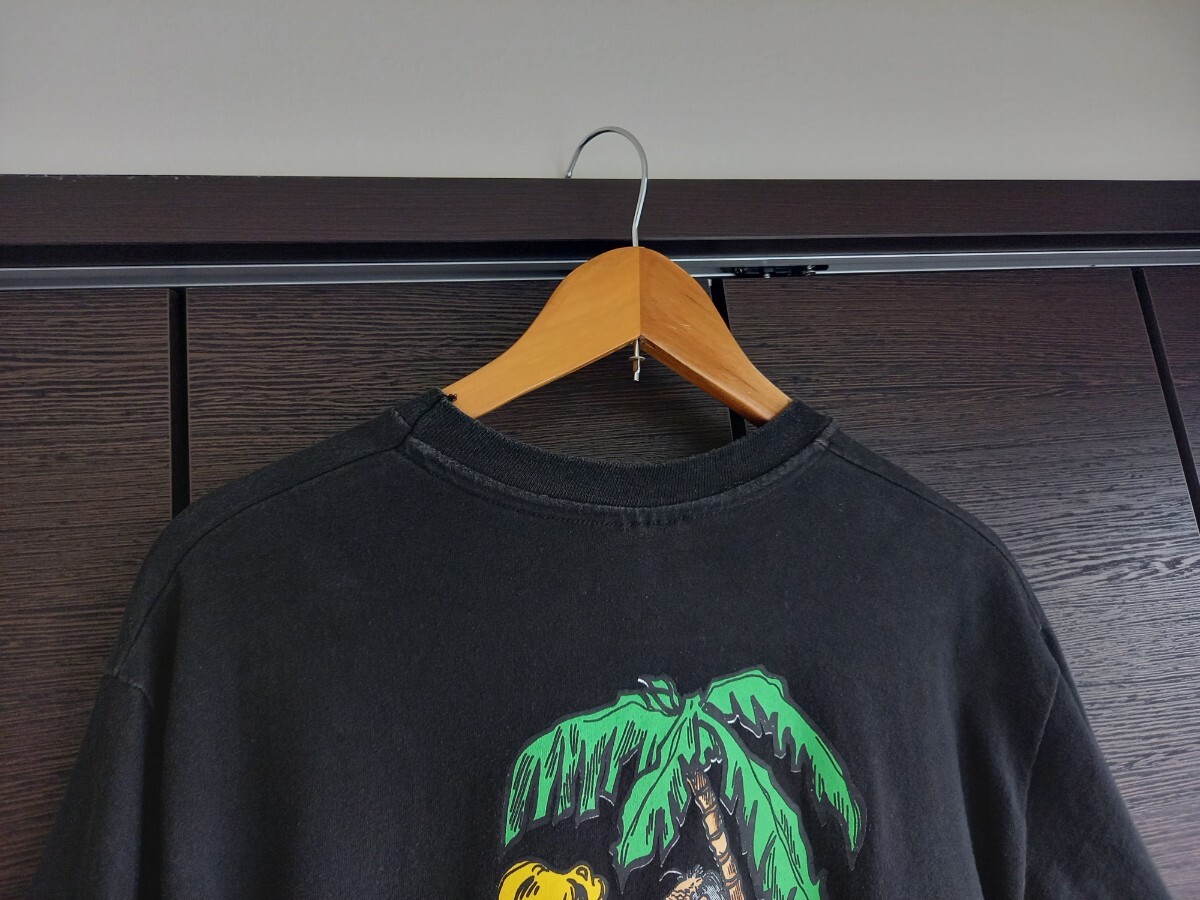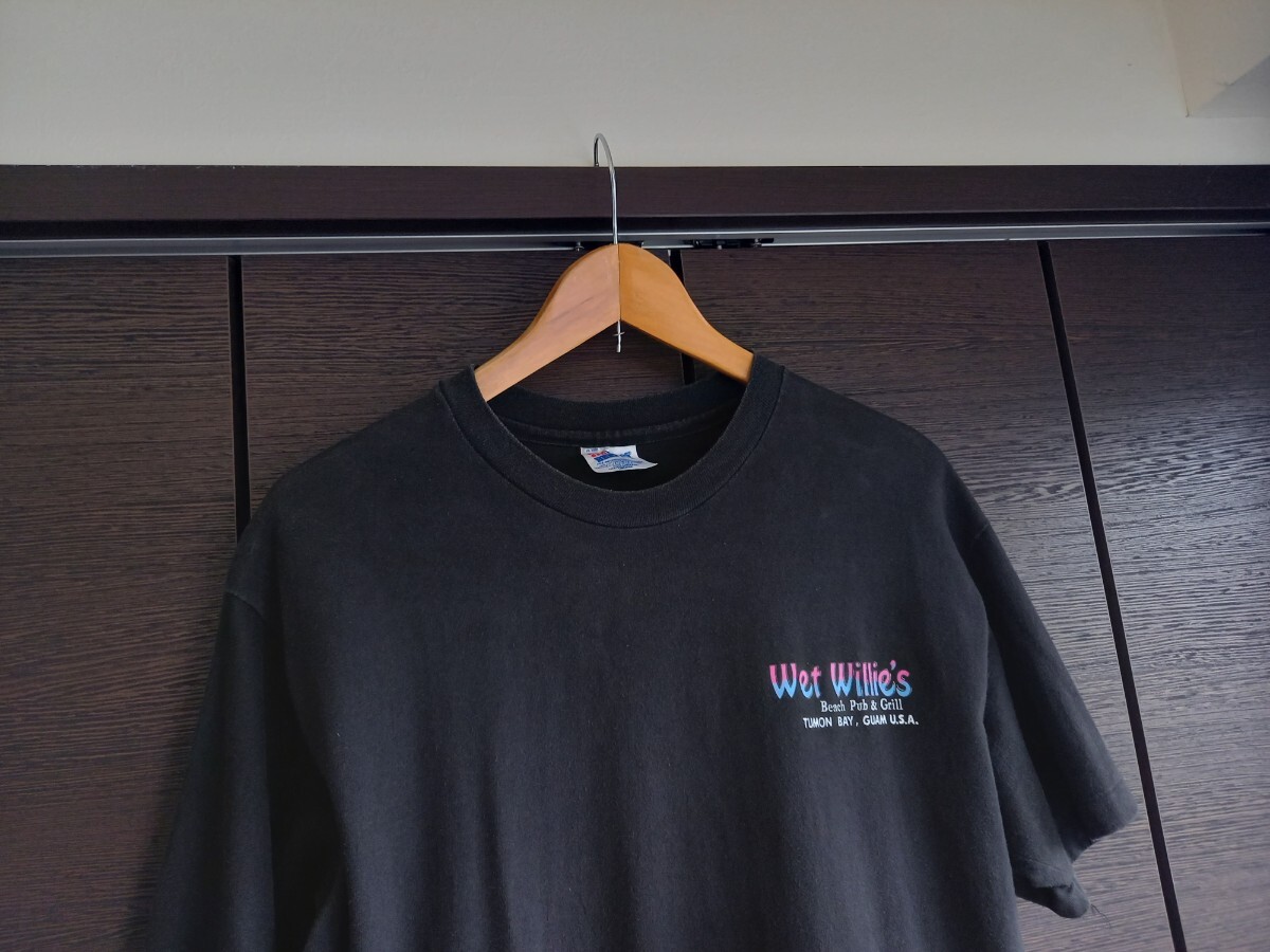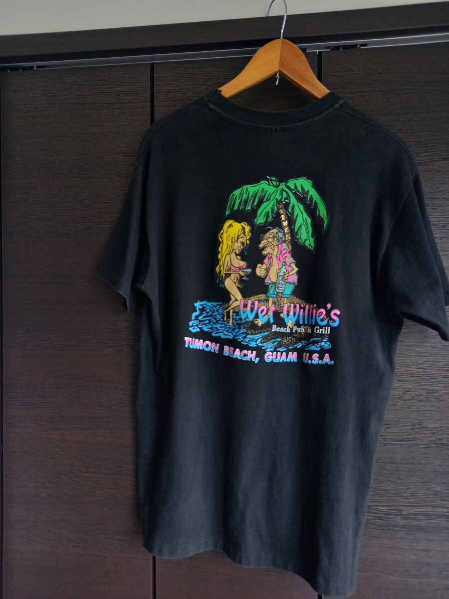 ビンテージ古着屋で購入した90s USA製 ビンテージ シングルステッチ Wet Willie's beach グアム ガール bar アメキャラ ブラック Tシャツ sizeMです。肩幅約52身幅約55着丈約70袖丈約20センチです。必ず当方の自己紹介欄を見てから質問、入札、落札してください。
