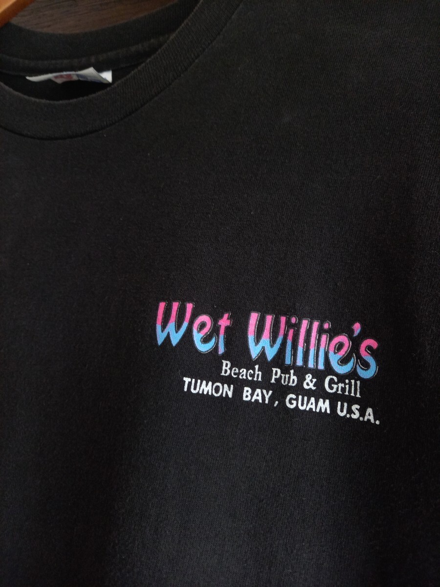 90s USA製 ビンテージ シングルステッチ Wet Willie's beach グアム ガール bar アメキャラ ブラック Tシャツ sizeM エロ 黒