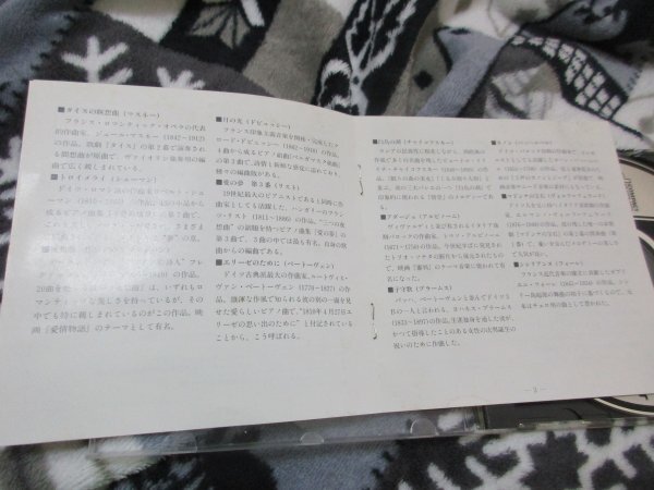 1 タイスの瞑想曲 演奏者:アランダール・モージ 楽器:バイオリン 演奏者:ダニツァ・モージオーバー 楽器:ピアノ 作曲者:マスネ 2 トロイメライ 演奏者:アランダール・モージ 楽器:バイオリン 演奏者:ダニツァ・モージオーバー 楽器:ピアノ 作曲者:シューマン 3 夜想曲第2番変ホ長調 演奏者:フー・ツォン 楽器:ピアノ 作曲者:ショパン 4 月の光 演奏者:ルクセンブルグ放送管弦楽団 演奏者:マルティーヌ・ジュリオ 楽器:ハープ 演奏者:パトリック・ガロワ 5 愛の夢第3番 演奏者:イエール・デームス 6 エリーゼのために 演奏者:イエール・デームス 7 白鳥の湖 演奏者:ロンドン・ジョフ・ラブ・オーケストラ 8 アダージョ 演奏者:パリ音楽祭室内(管) 演奏者:パトリック・ガロワ 9 ブラームスの子守歌 演奏者:イエール・デームス 10 カノン 演奏者:パリ音楽祭室内(管) 演奏者:パトリック・ガロワ 11 マドンナの宝石 演奏者:ロンドン・ジョフ・ラブ・オーケストラ 12 シシリアンヌ 演奏者:ルクセンブルグ放送管弦楽団 演奏者:マルティーヌ・ジュリオ 楽器:ハープ 演奏者:パトリック・ガロワ 13 G線上のアリア 演奏者:パリ音楽祭室内(管) 演奏者:パトリック・ガロワ 楽器:フルート 14 雨だれ 演奏者:ガブリエル・チョドス 15 ユーモレスク 演奏者:アランダール・モージ 楽器:バイオリン 演奏者:ダニツァ・モージオーバー 16 乙女の祈り 演奏者:イエール・デームス 17 天使の夢 演奏者:ロンドン・ジョフ・ラブ・オーケストラ