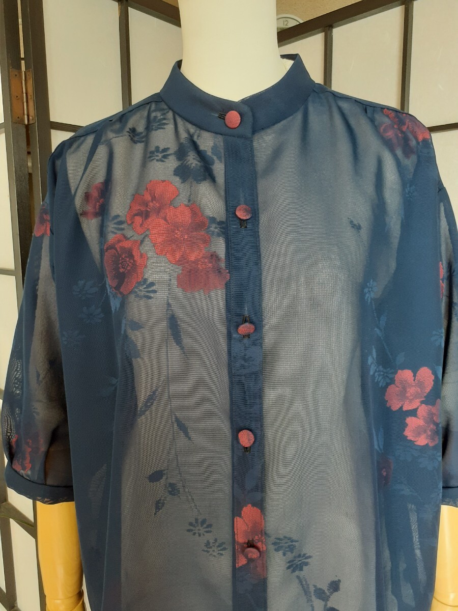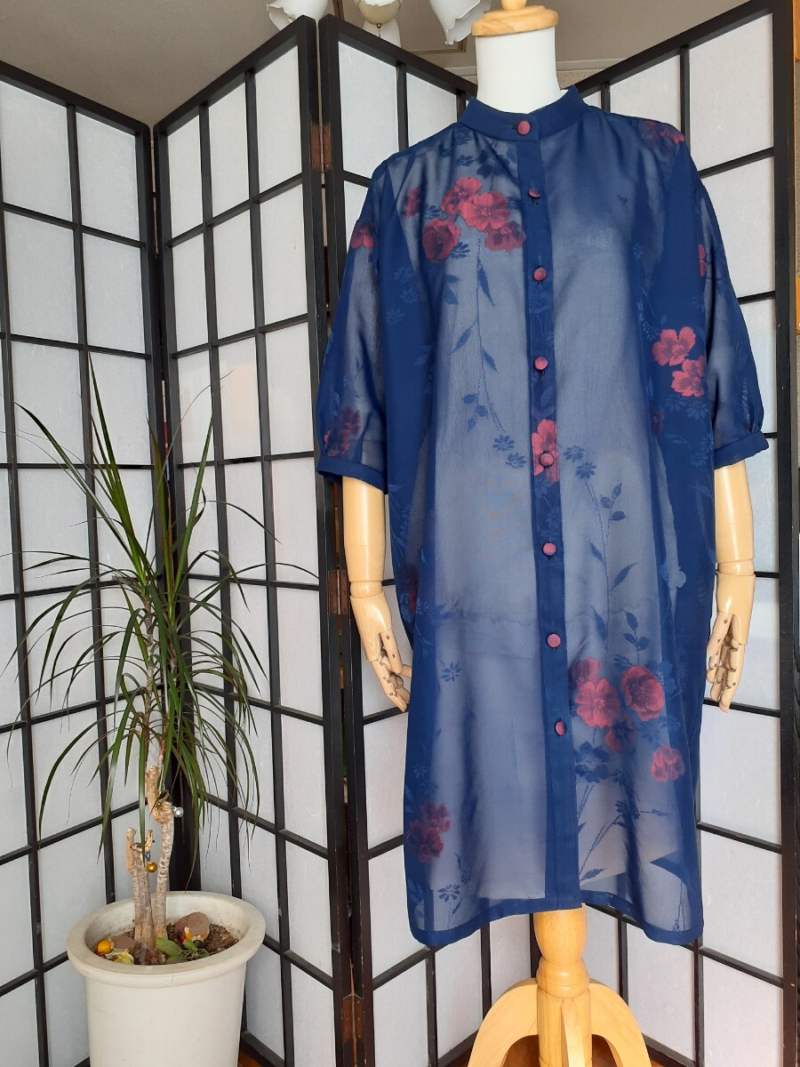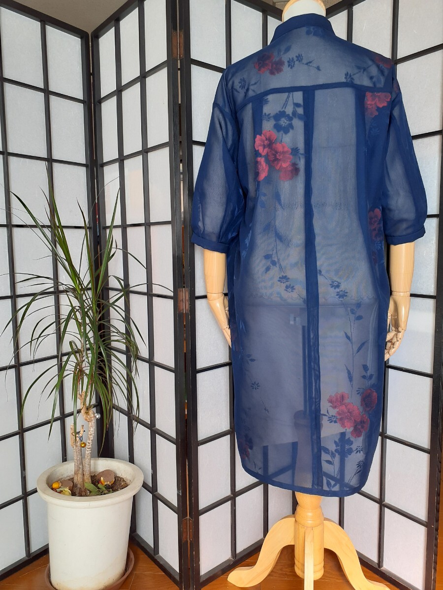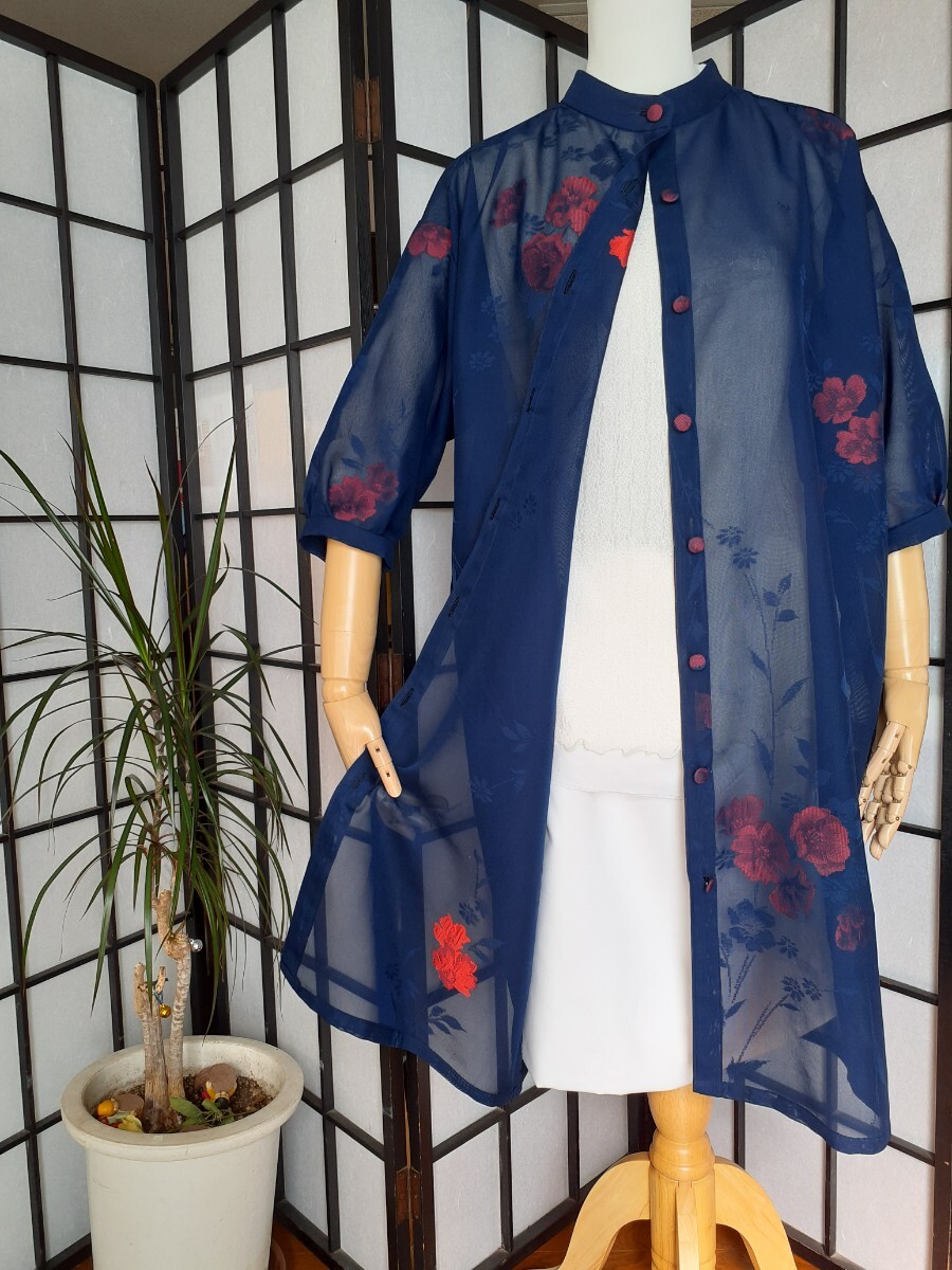 Product name: 着物リメイク羽織物チュニック 紺色に赤の花柄 正絹 紗で透け涼しげ 夏コート