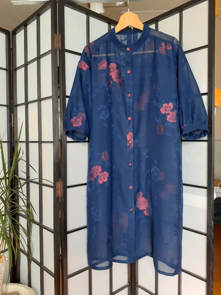 正絹紺地の紗のお着物をほどきお洗濯後にリメイクしました。赤のお花はグラデーションで奥ゆかしさがあります。紗で透け感があり涼しさを誘います。お襟はスタンドカラーで首の日焼け防止になっています。