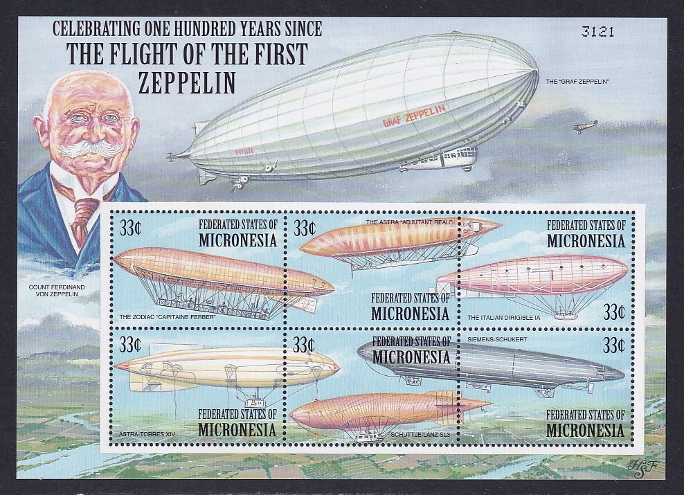 6 ミクロネシア【未使用】<「2000 SC#390,391-392 ツェッペリン号初飛行&飛行船開発100年」 組合せ小型シート(6種連刷),小型シートx2 >
