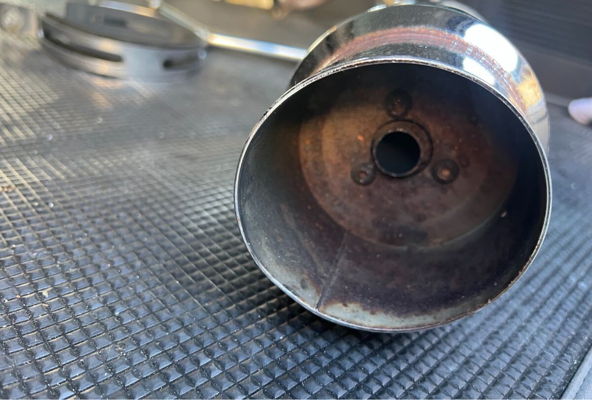全体にキズ汚れサビ焼けありますがガリキズや穴開きは無いです。マフラー振っても音しないので内部も大丈夫です。ネジ類は付いていませんので落札者様で用意して下さい。