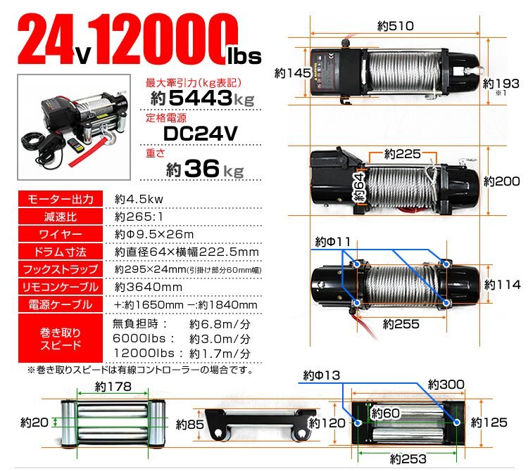 Product name: 【数量限定セール】電動ウインチ 無線リモコン付属 牽引 12000LBS 5444kg DC24V 電動 ウインチ 引き上げ機 牽引 けん引 防水仕様 クロカン