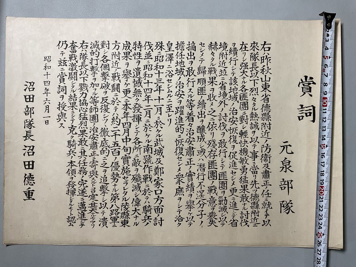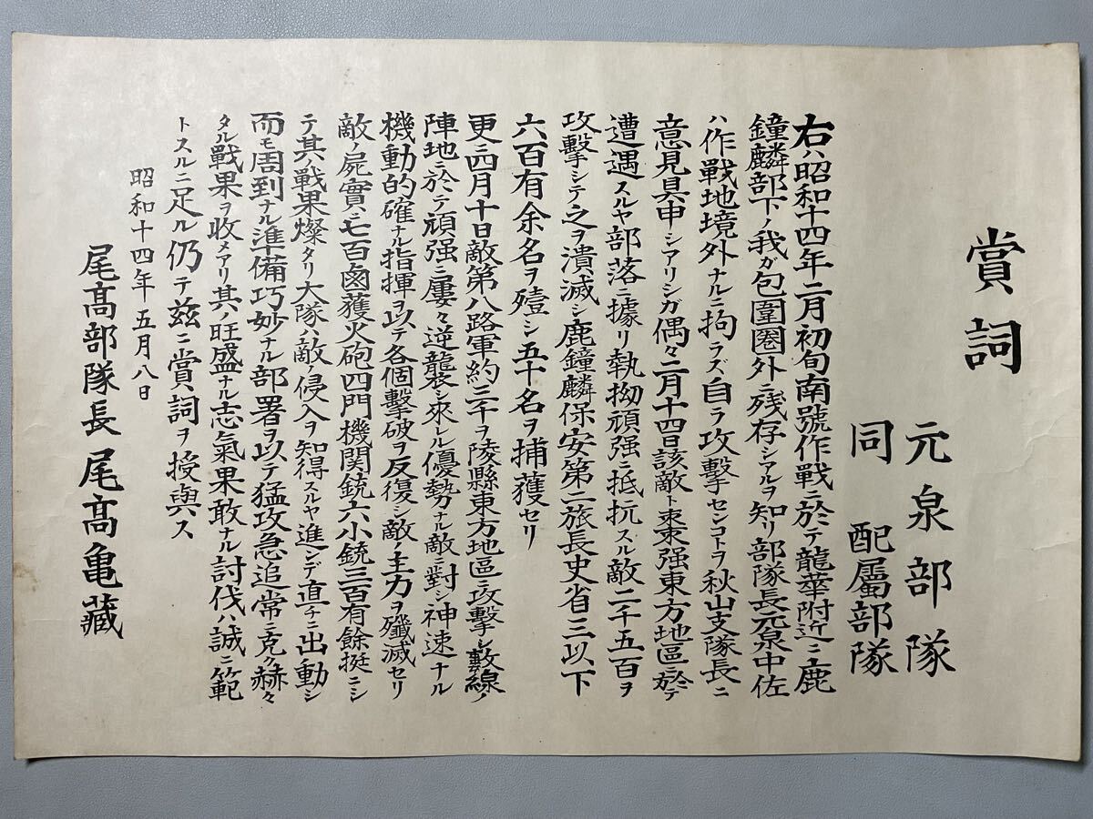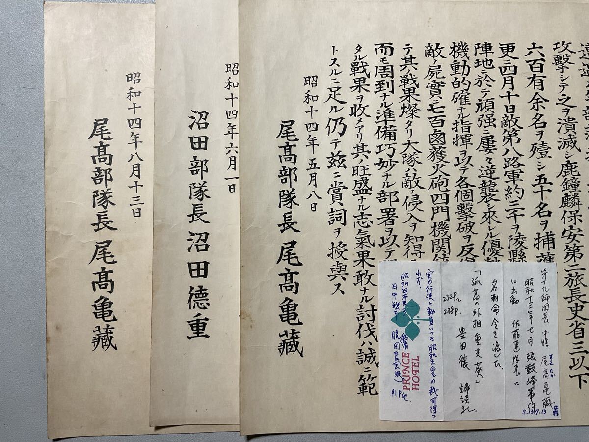 元泉部隊 賞詞3枚 昭和14年 第八路軍 鹿鍾麟 山東省 魯西作戦 龍華 鄭家口 南號作戦 唐本和本中国満州支那事変画報