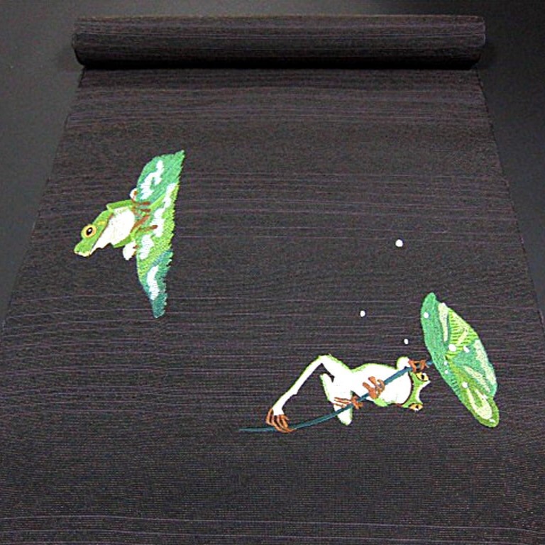 Product name: 単衣・夏物に! スリーシーズン 新品未仕立 西陣織刺繍九寸名古屋帯 カエル 蛙 焦茶
