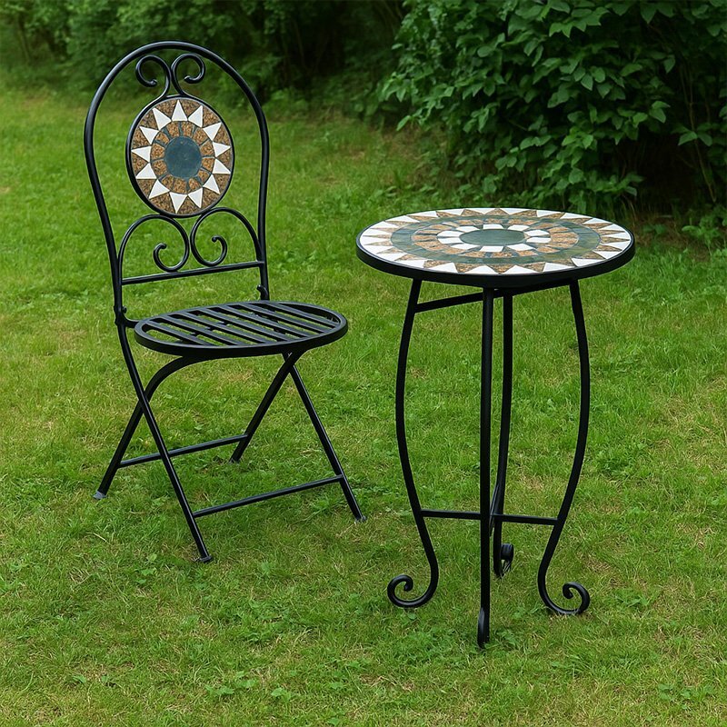 職人技が光るモザイクタイル天板と、優美なカーブを描くアイアン脚が特徴のガーデンテーブルです。グリーン・ホワイト・テラコッタ調の幾何学模様が自然と調和し、どんな屋外空間にも映えるデザイン。中庭・バルコニー・玄関先など、さまざまなシーンで活躍します。