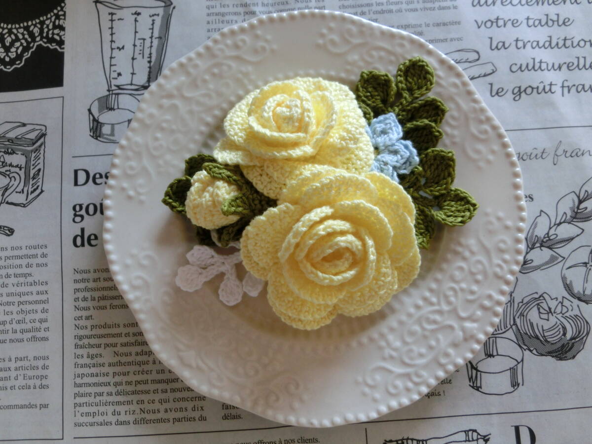 ☆ 2430  薔薇のブーケ  黄色系薔薇  クロシェレース  コサージュ  ハンドメイド