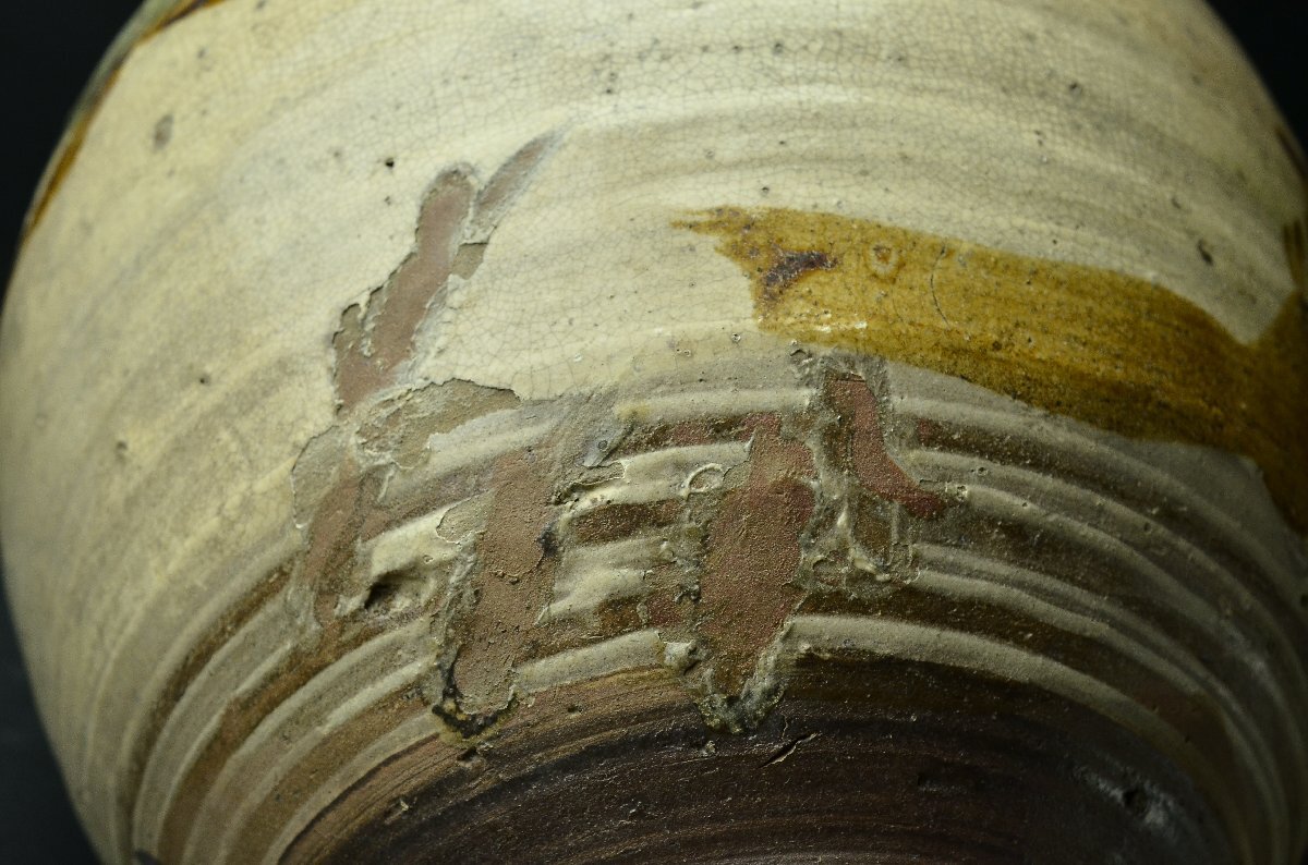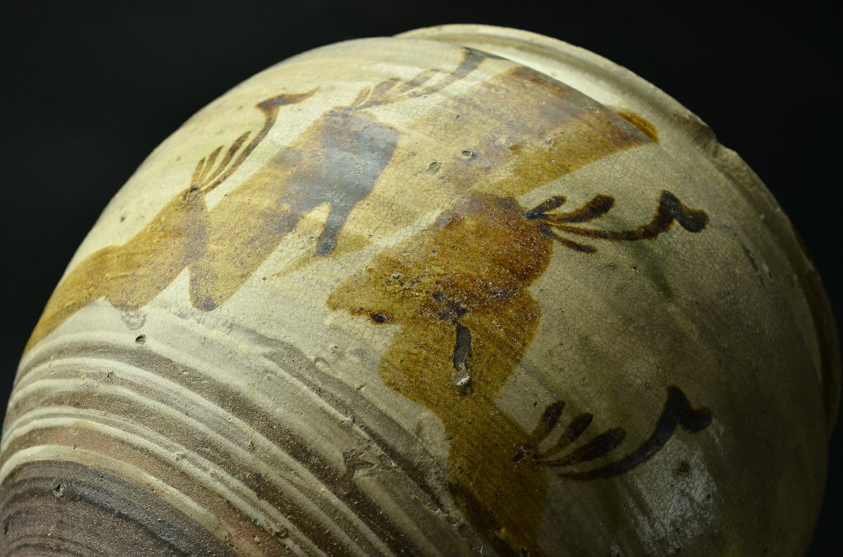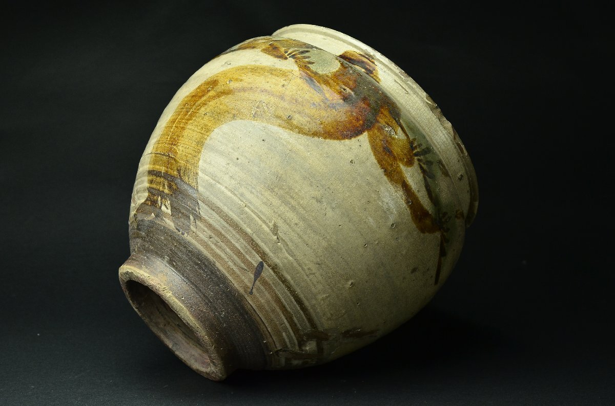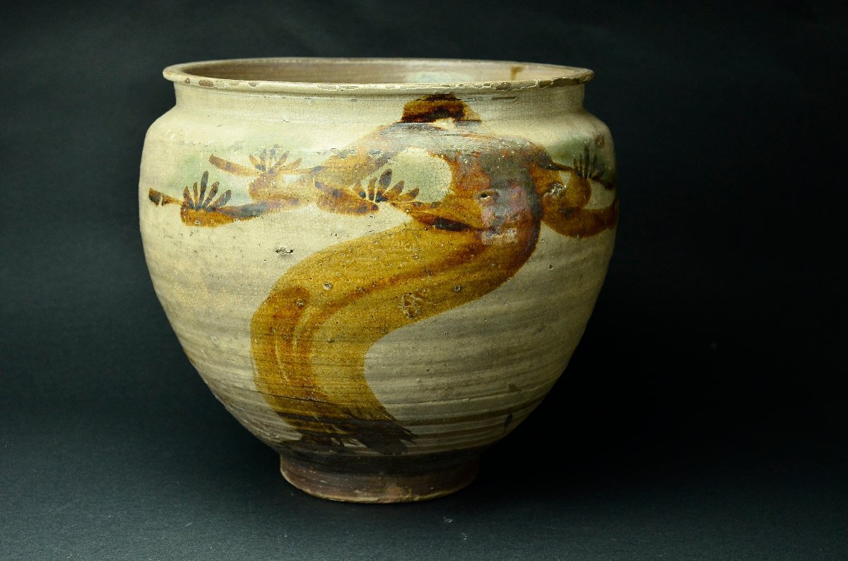 江戸時代 松絵二彩唐津焼壺・松絵紋弓野焼壺(古武雄)
