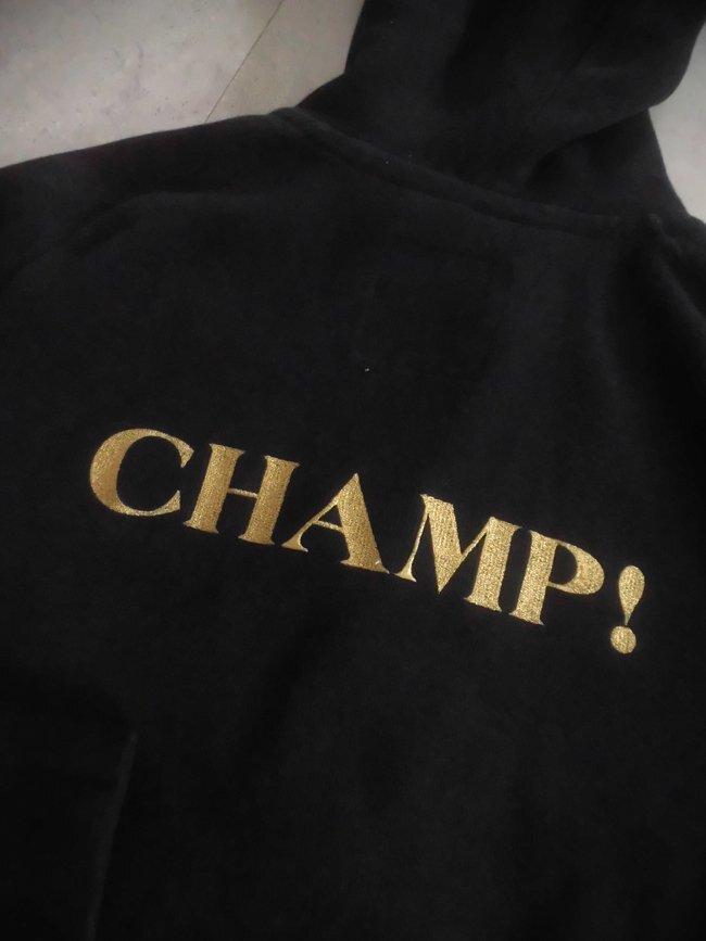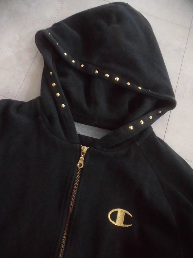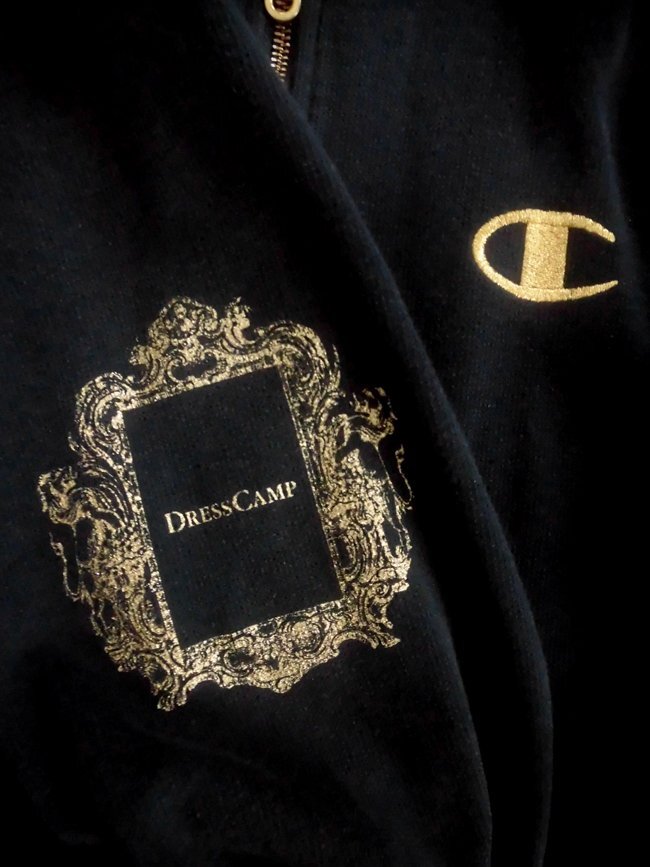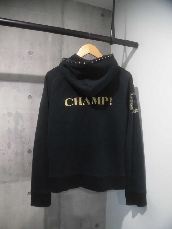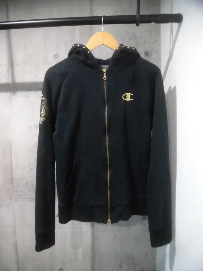Product name: DRESSCAMP ドレスキャンプ x Champion チャンピオン コラボ CHAMP! 刺繍 スタッズ ジップパーカー 46(M)/裏起毛ZIPフーディ/黒 金/メンズ
