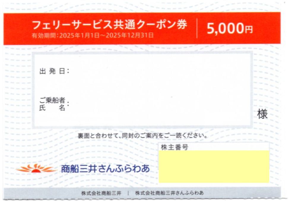 商船三井の株主優待券の商船三井さんふらわあ フェリーサービス共通クーポン券 5000円券です。