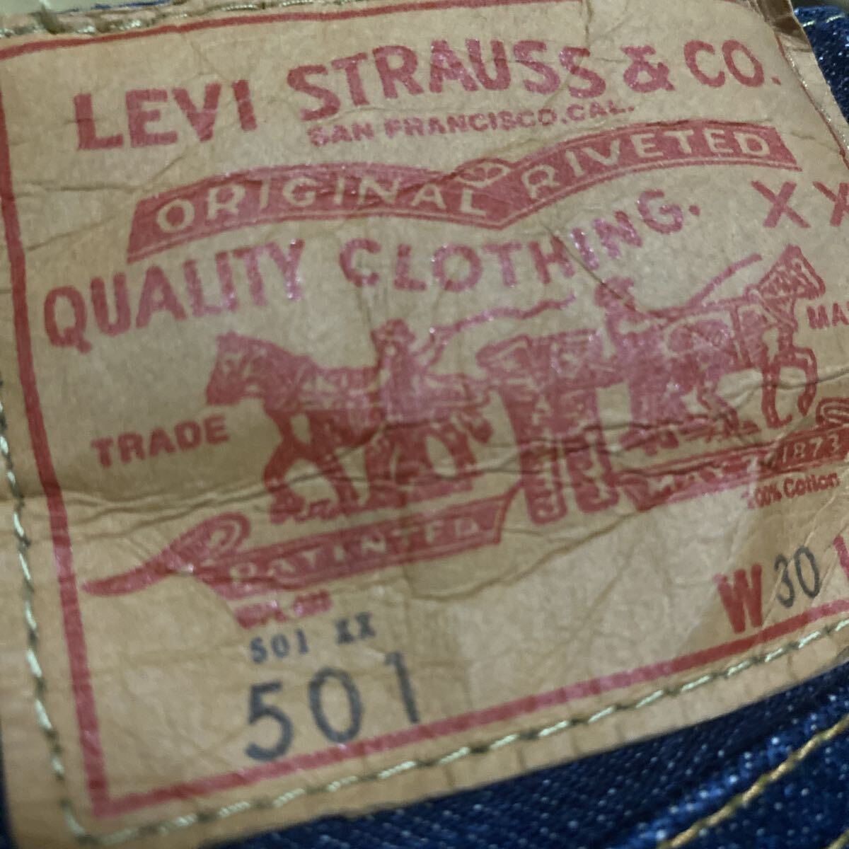 501XXの特徴的なボタンフライ 赤Eタブ Vステッチ セルビッジ(赤耳)等が見受けられます。