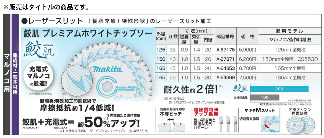 レーザースリット■「樹脂充填+特殊形状」のレーザースリット加工■鮫肌プレミアムホワイトチップソー 充電式マルノコに最適!■新開発:特殊加工印刷技術で摩擦抵抗約1/4低減! 鮫肌プレミアムホワイト+充電式マルノコ=約50%アップ※1 ※1 1充電あたりの作業量(当社従来品のレーザーダブルスリットチップソー(A-48533)比)■耐久性約2倍※2 ※2当社従来品のプレミアムタフコーティングチップソー(A-49367)比■定期振動波を吸収。 屑排出性向上。 交番振動を吸収する特殊刃袋。■超硬質特殊チップ採用 鋭い研ぎ角と最適な刃列パターン■切削音を低減、マキタMスリット■オモテ・ウラ両面処理