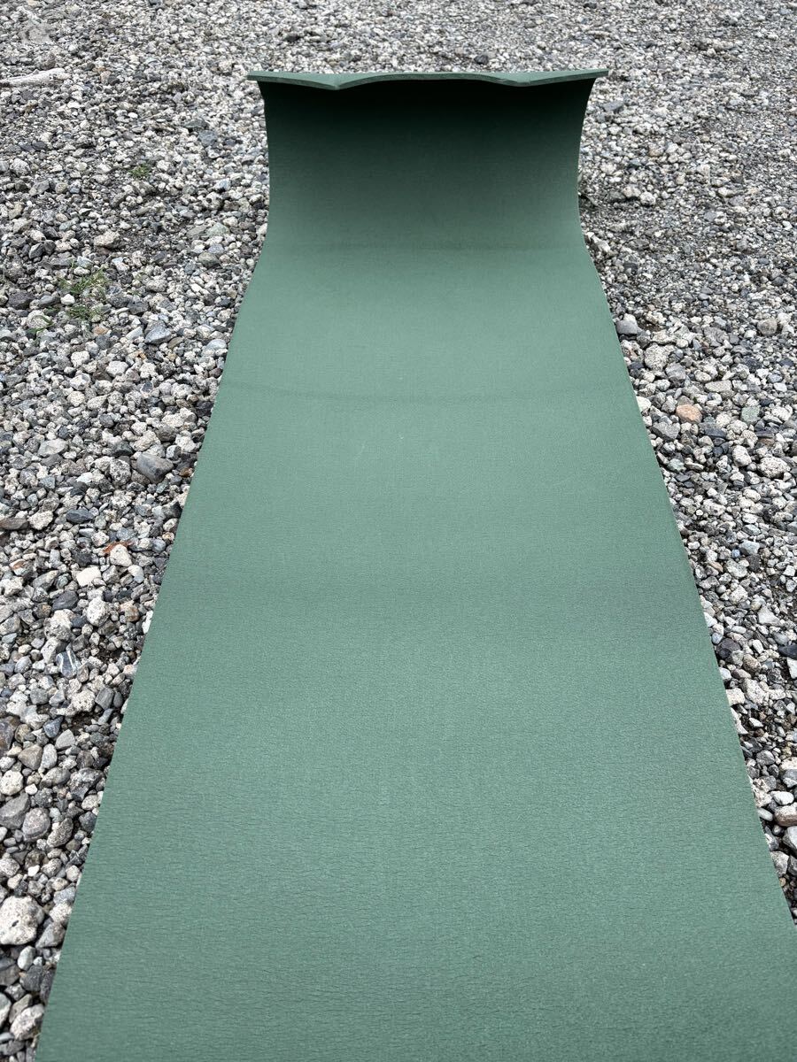 ロール式のグリーンスリーピングマット、持ち運びに便利なストラップ付き。