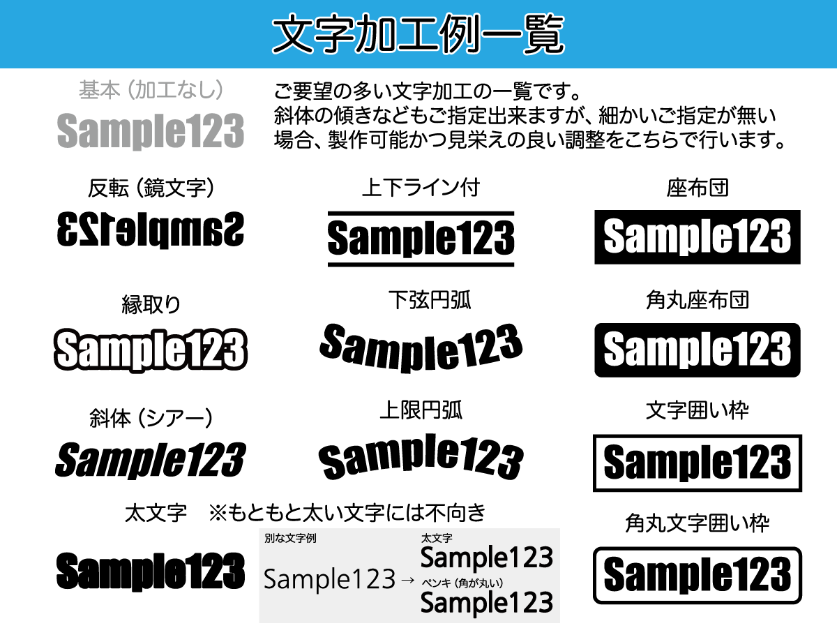 お好きな書体・サイズ・塗装用タイプ(AorB)をお選びいただき、マスキングステッカー(転写フィルム付)を製作いたします。