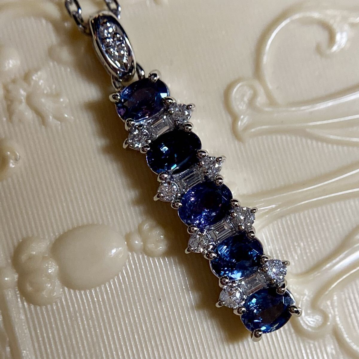 間に添えられたダイヤモンドがアレキサンドライトの色変化をより際立たせ、光の反射によって胸元に華やかな立体感を生み出しています。