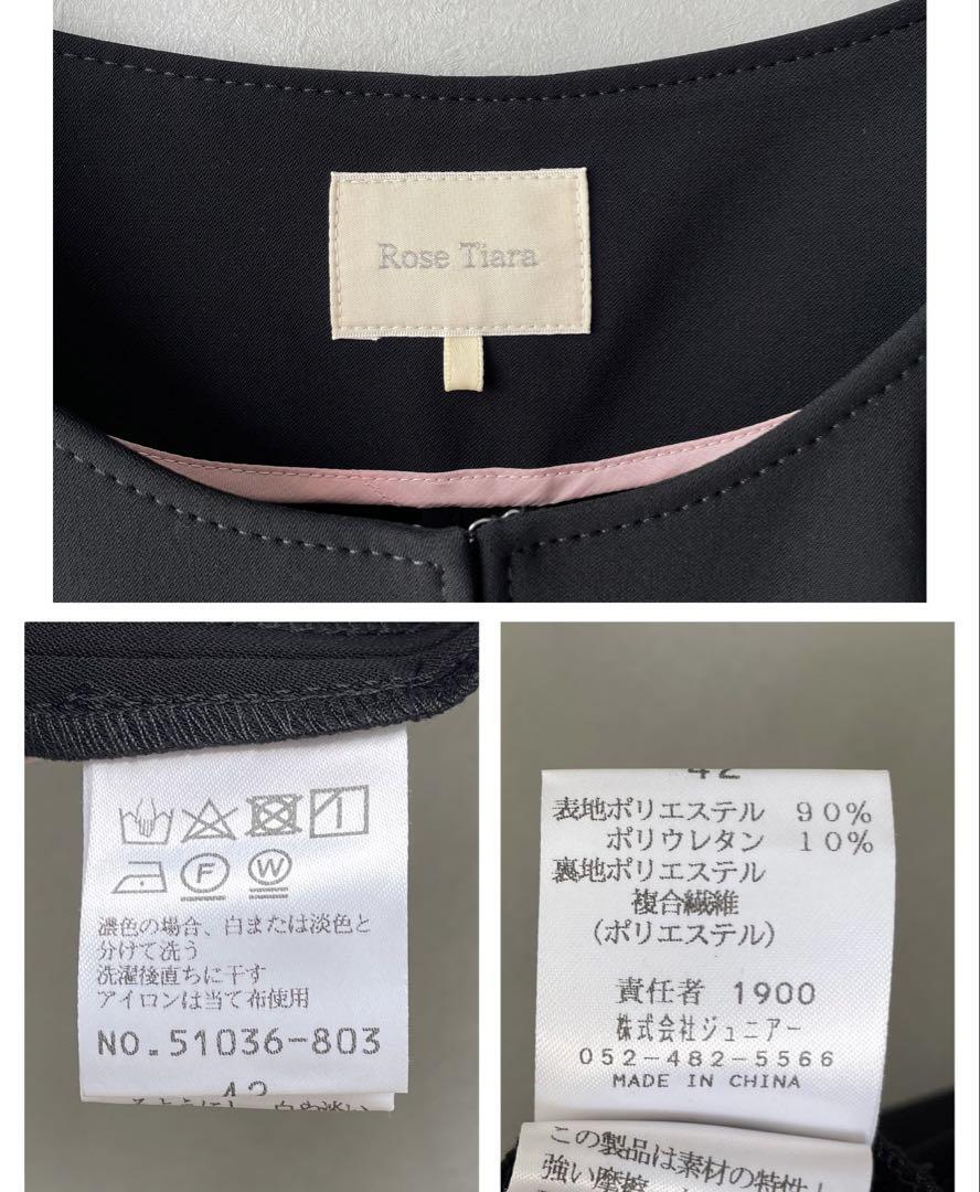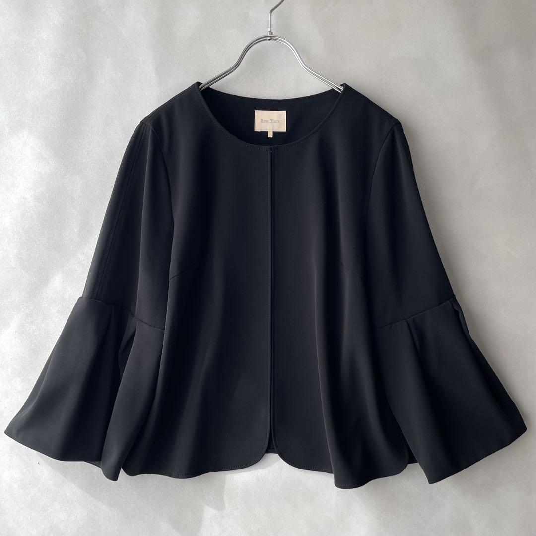 極美品 ローズティアラ サイズ42 サイズXL 袖フレア ノーカラージャケット レディース 黒 ブラック 伸縮有り 手洗い可