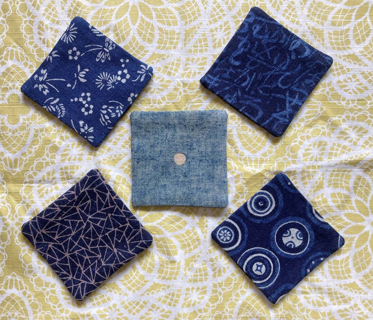 ほぼ未使用の藍染はぎれを手縫いで作ったコースター5枚セットです